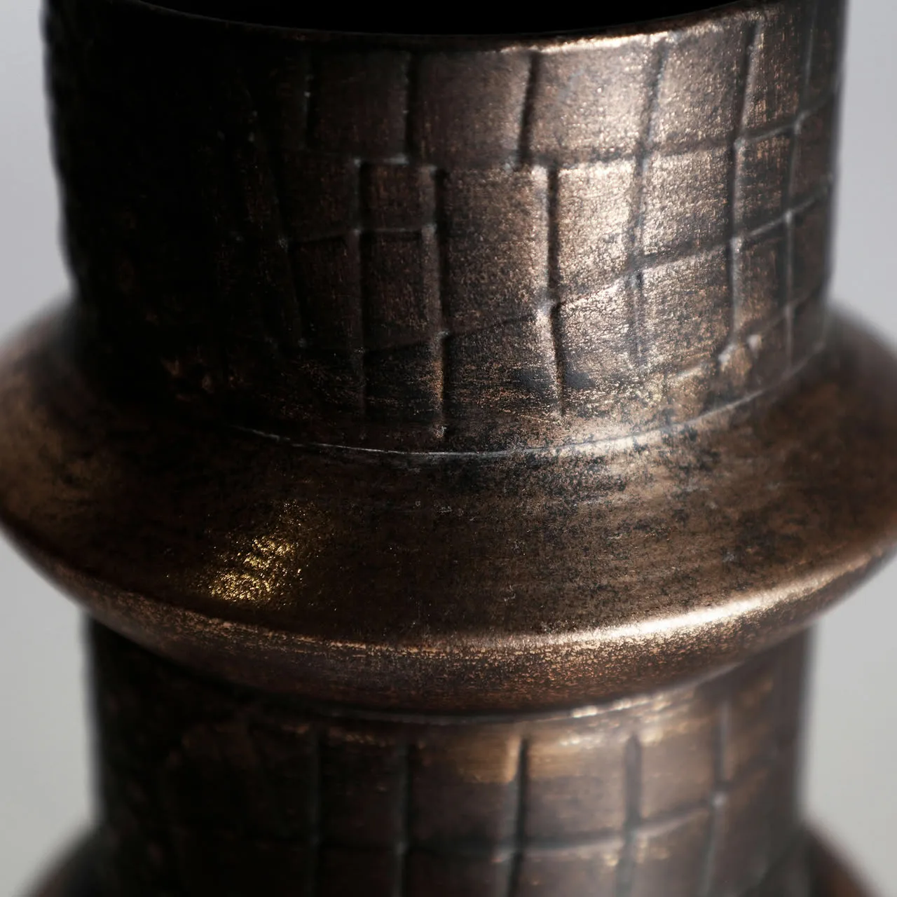 Jarrón redondo vesc de estilo art deco, fabricado en hierro en color oro con acabado antic.