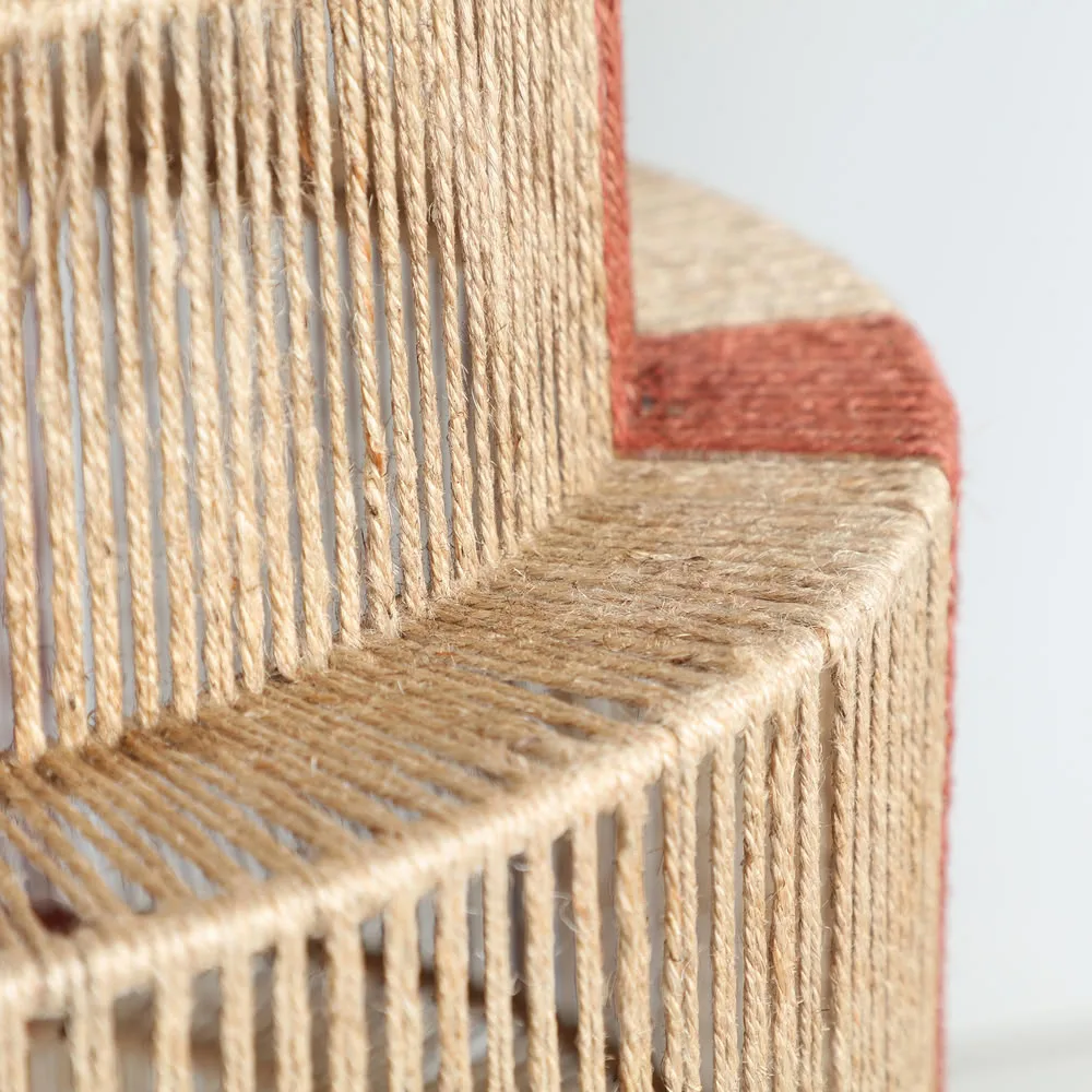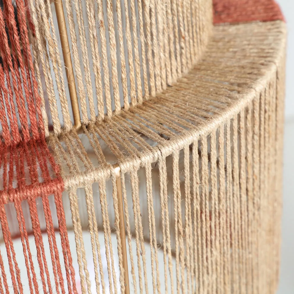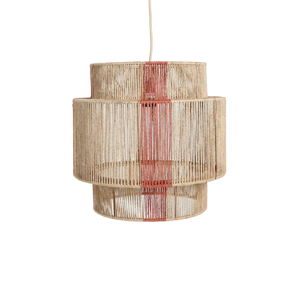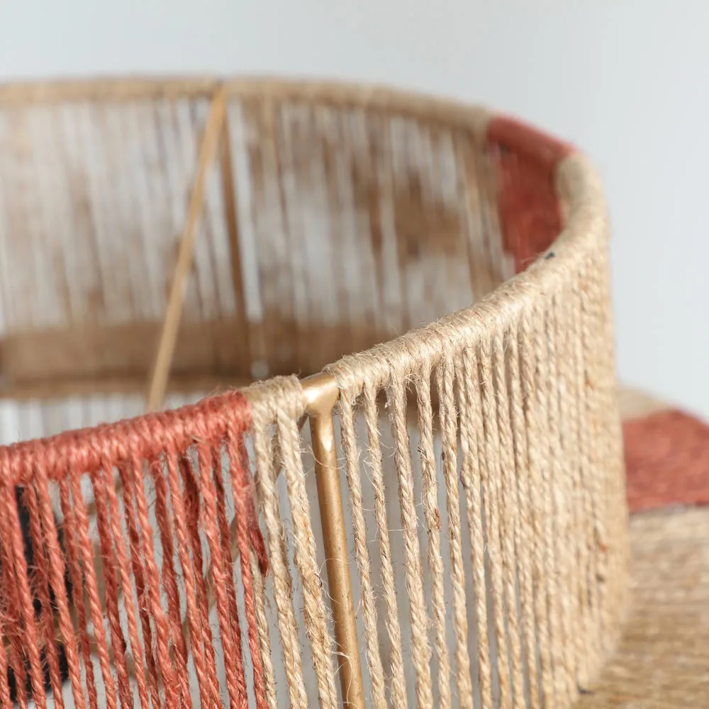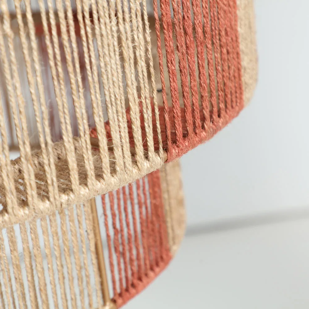 La lámpara colgante Izamal, con su diseño en capas y detalles sutiles en color, es una pieza que fusiona tradición y modernidad. Su estructura tejida a mano difunde la luz de manera cálida y armoniosa, ideal para crear ambientes acogedores en comedores, salas o espacios con un estilo boho-chic y natural. Una lámpara de estilo boho, fabricada en yute en color marrón claro, combinado con hierro en color marrón en color rojo.