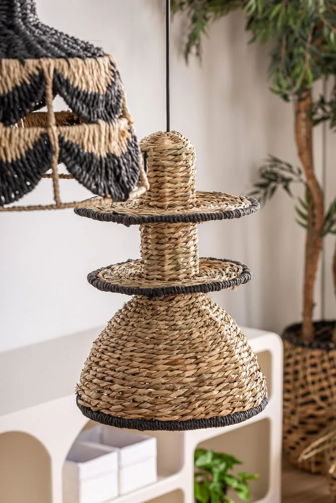 La esencia del estilo boho hecha luz. Kasses está tejida con cuerda en color natural y estructura de hierro, evocando tradición artesanal y ligereza visual. Ideal para ambientes relajados y cálidos.