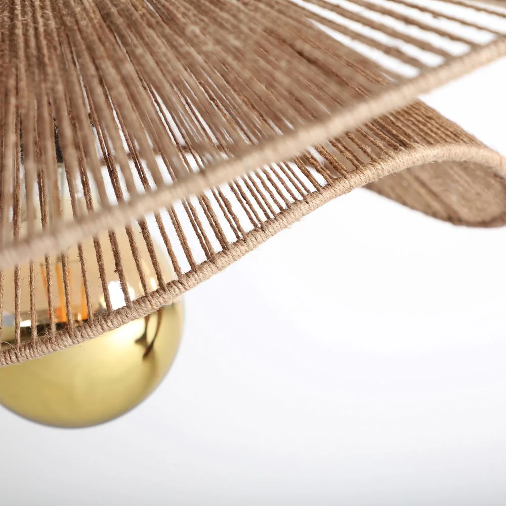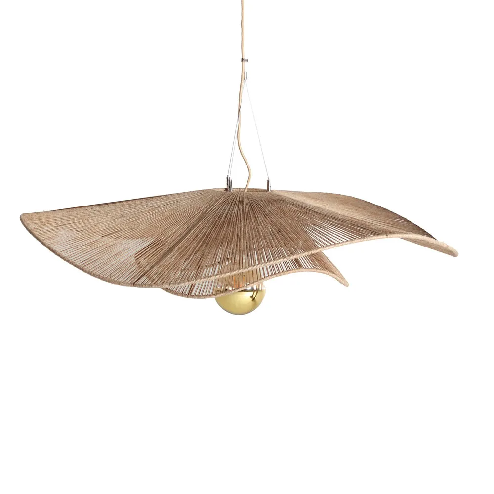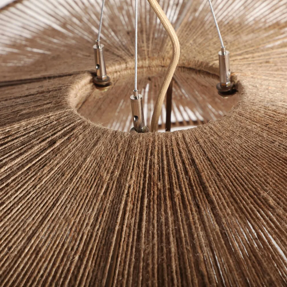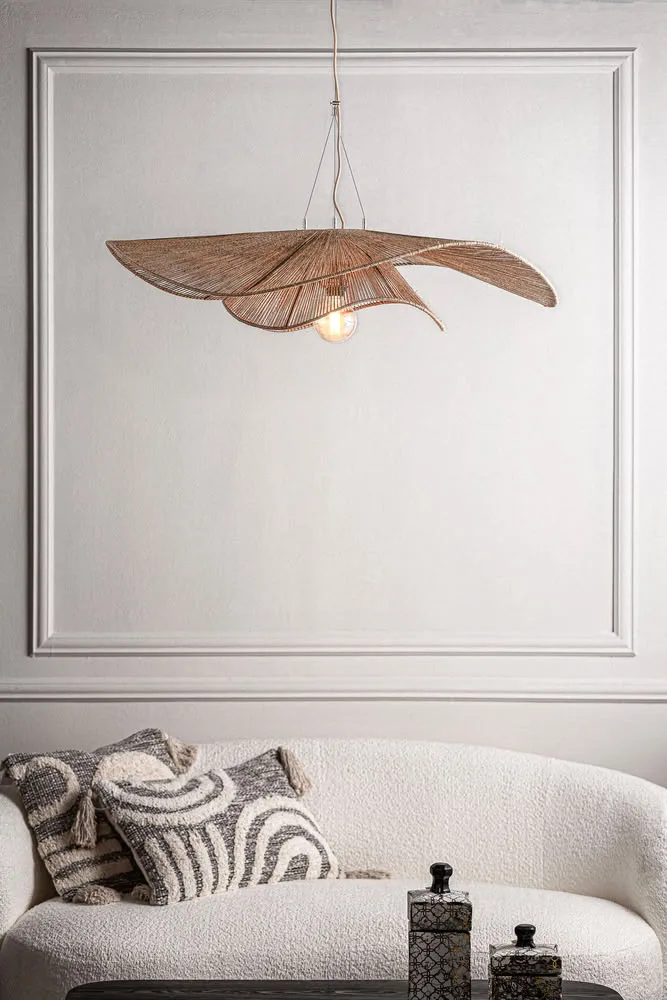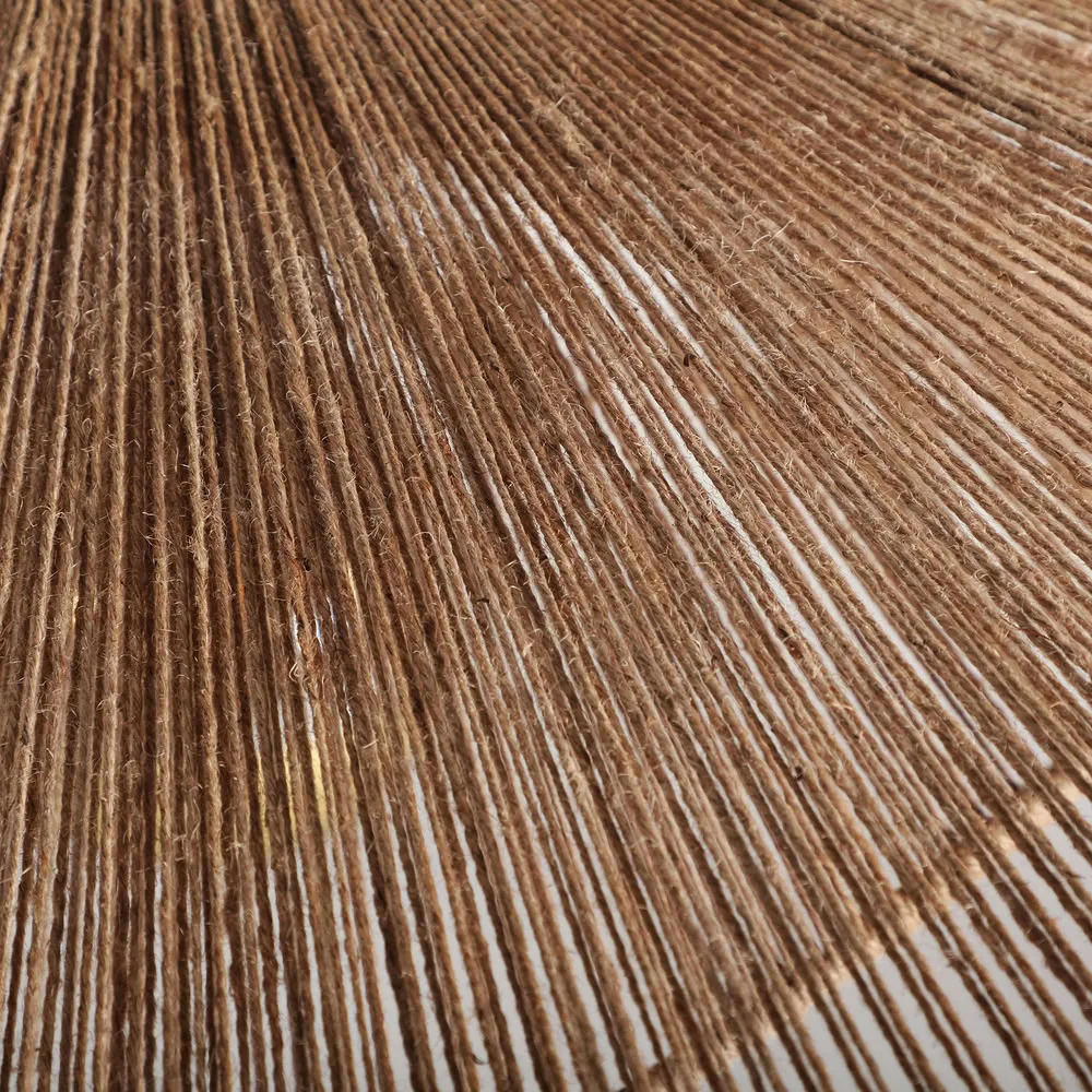 Las lámparas de techo Khed, fabricadas en yute en color natural, con dimensiones de 102x102x27cm, son piezas decorativas que emiten una luz suave y acogedora. Su diseño tejido y su material natural hacen de estas lámparas elementos claves para crear ambientes cálidos y armoniosos, destacando por su autenticidad y su estilo bohemio y relajado.