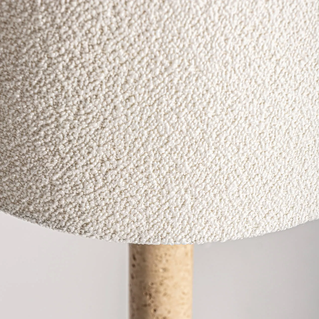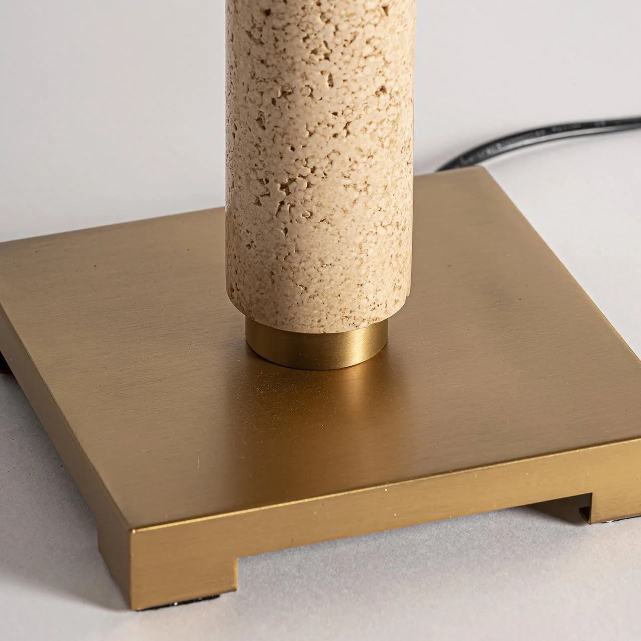 Lámpara de sobremesa Alina de estilo art deco, fabricado en hierro en color oro, combinado con mármol en color marrón claro y algodón bouclé en color blanco roto. Producto desmontable.