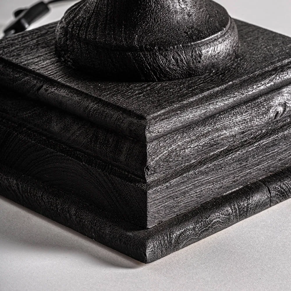 Lámpara de sobremesa de estilo colonial fabricado en madera de mango en color negra combinado con algodón en color blanco y hierro en color oro con acabado viejo. Producto desmontable.
