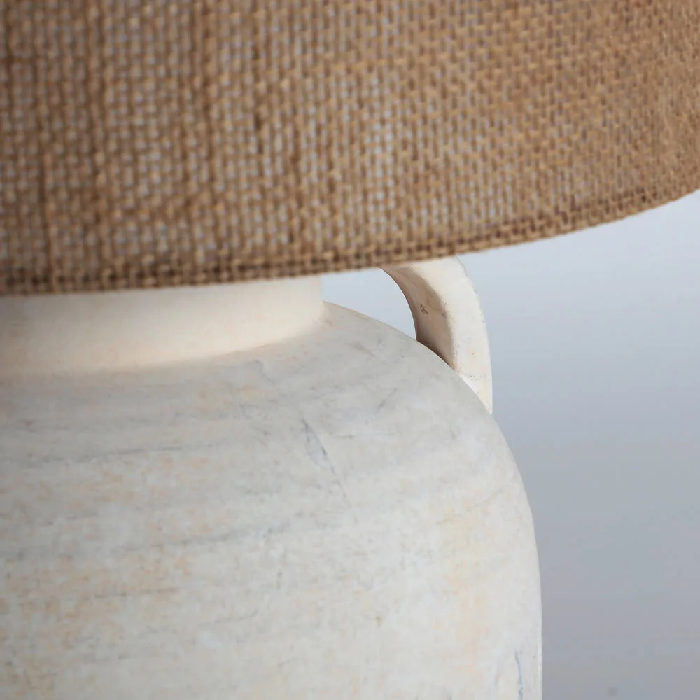 Lámpara de sobremesa de estilo clásico, fabricado en cerámica en color blanco roto, combinado con poliéster en color marrón. Producto desmontable.