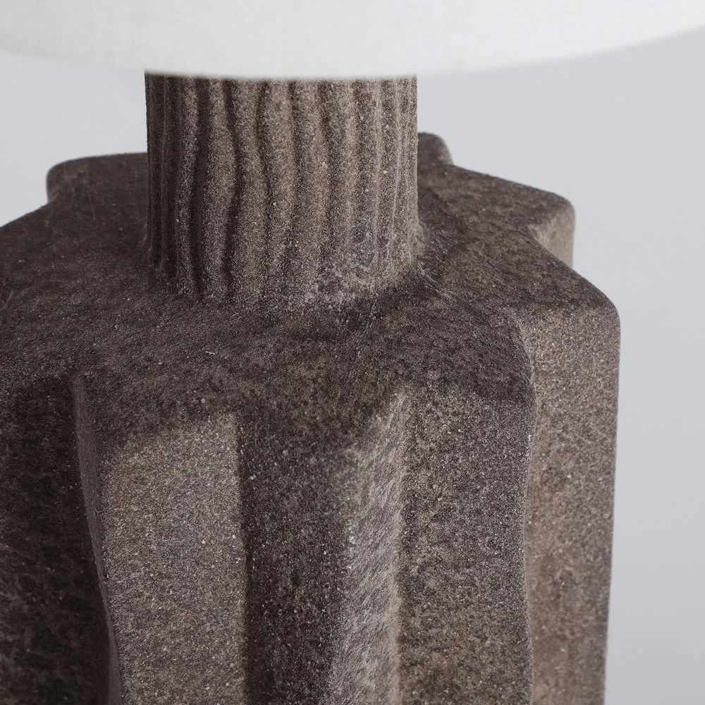 La lámpara de sobremesa Orvik combina volumen escultórico y una luz serena a través de su base de cerámica gris con acabado rugoso y su pantalla textil en blanco roto. Una pieza de fuerte presencia visual y tacto matérico, pensada para crear ambientes equilibrados y sofisticados donde la iluminación se convierte en un elemento decorativo esencial.