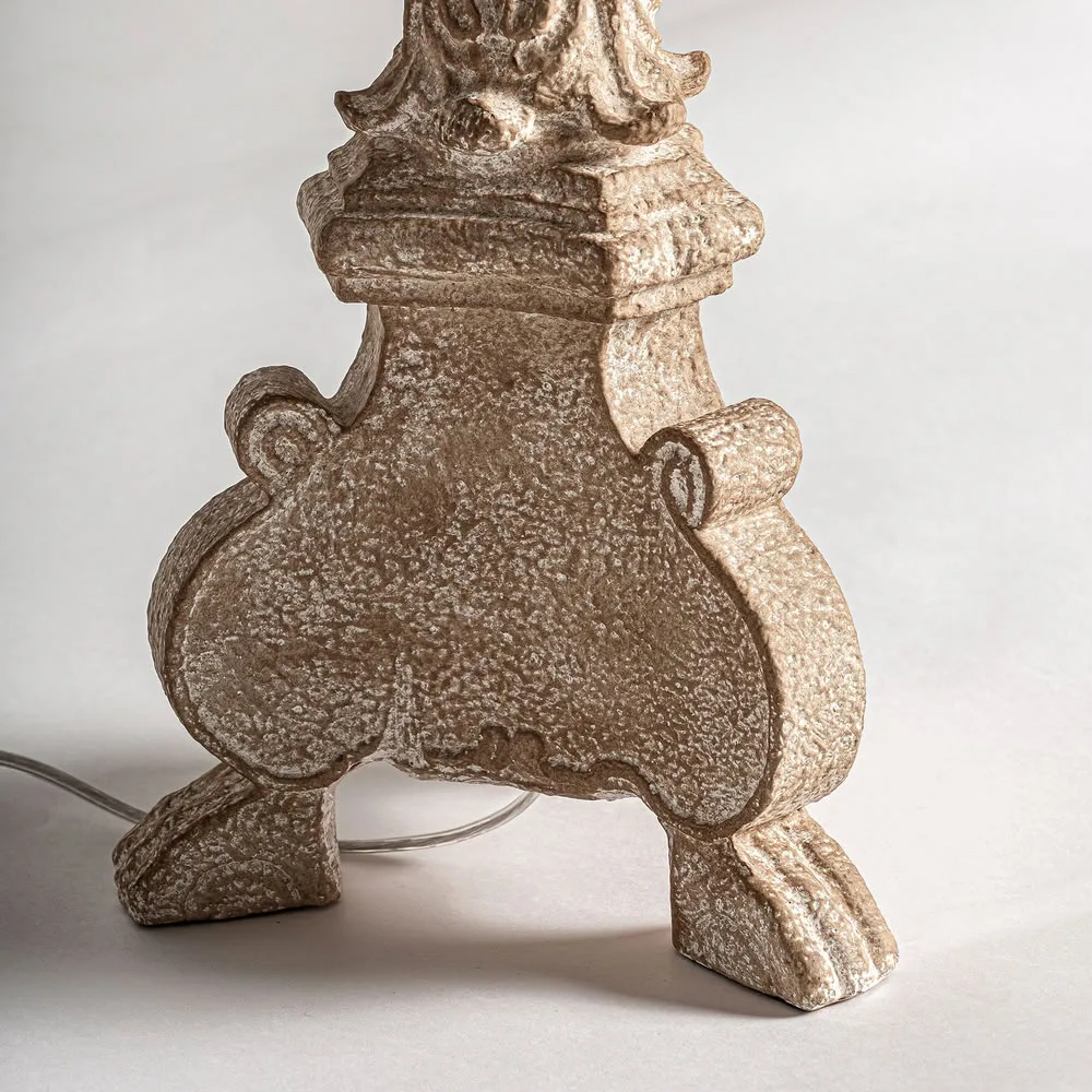 Lámpara de sobremesa de estilo provenzal fabricado en resina en color marrón combinado con algodón en color beige. Producto desmontable.