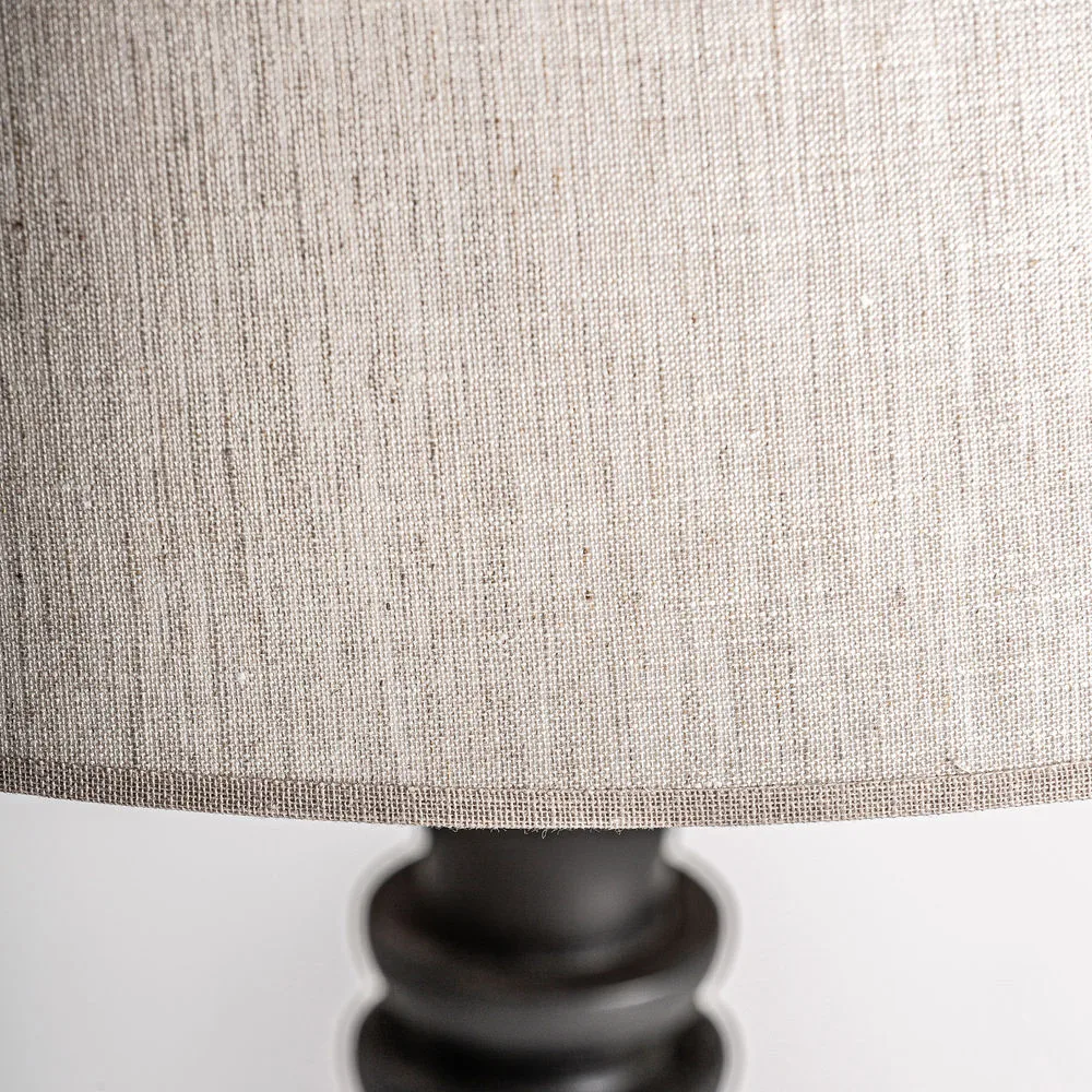Lámpara de sobremesa de estilo vintage fabricado en terracota en color negro con acabado envejecido combinado con lino en color beige.