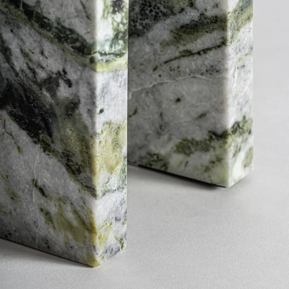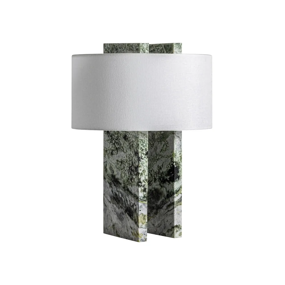 Lámpara de sobremesa Viridis de estilo art deco fabricado en mármol en color tonos en verde combinado con hierro en color oro y algodón en color blanco. Producto desmontable.