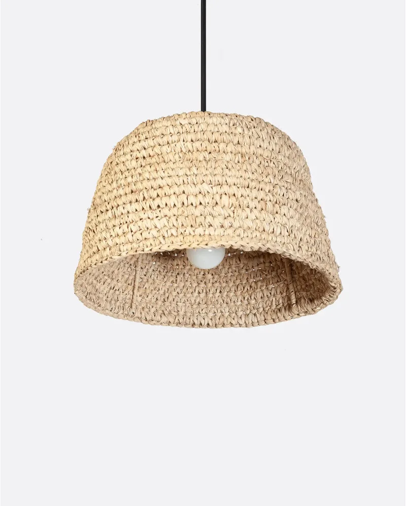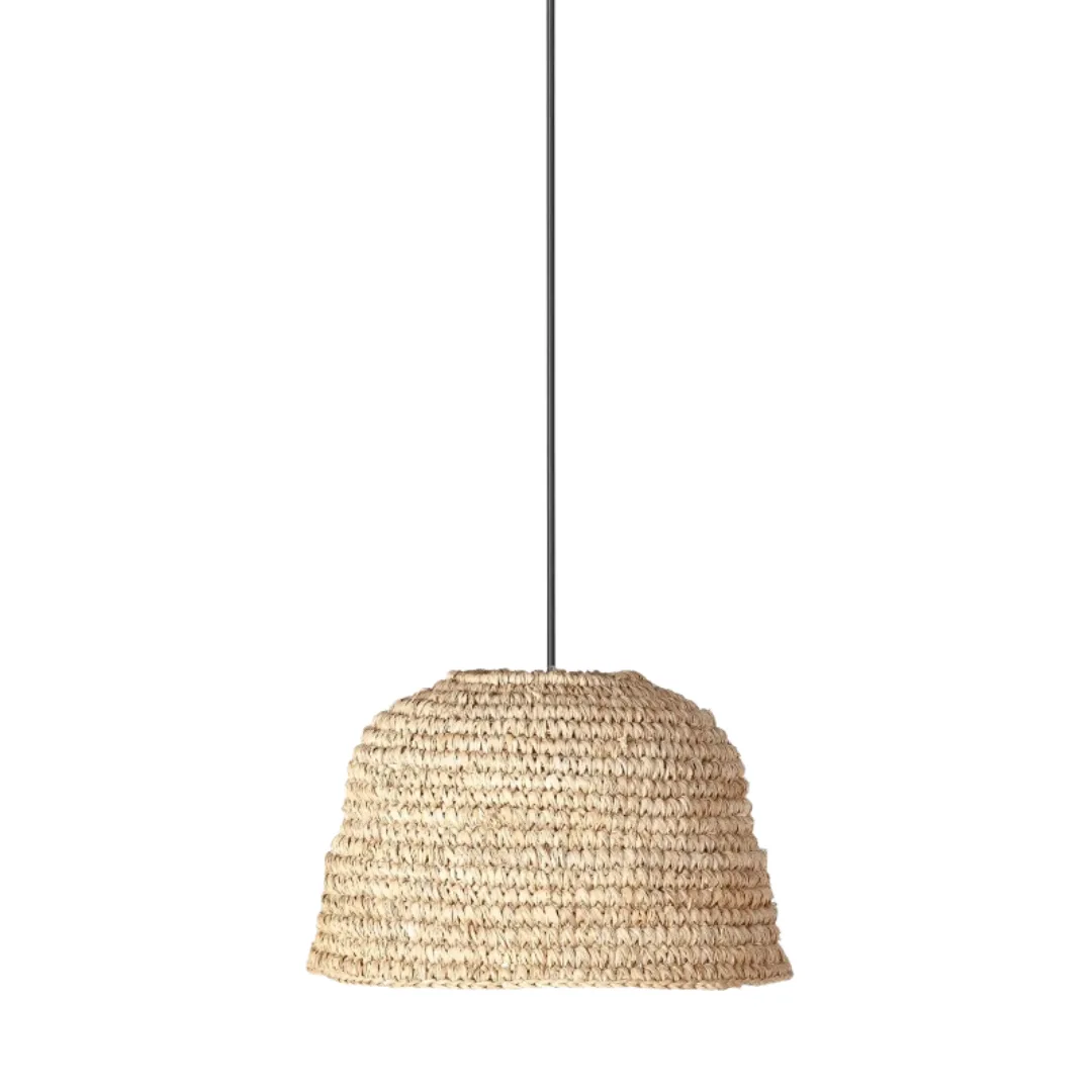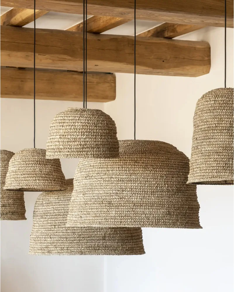 Lámpara de techo de alga natural trenzada con estructura de hierro de Dareels, una pieza ligera y orgánica que filtra la luz creando una atmósfera cálida y acogedora. Su diseño artesanal y su tamaño versátil la hacen perfecta tanto para instalar de forma individual como en композиções de varias alturas.