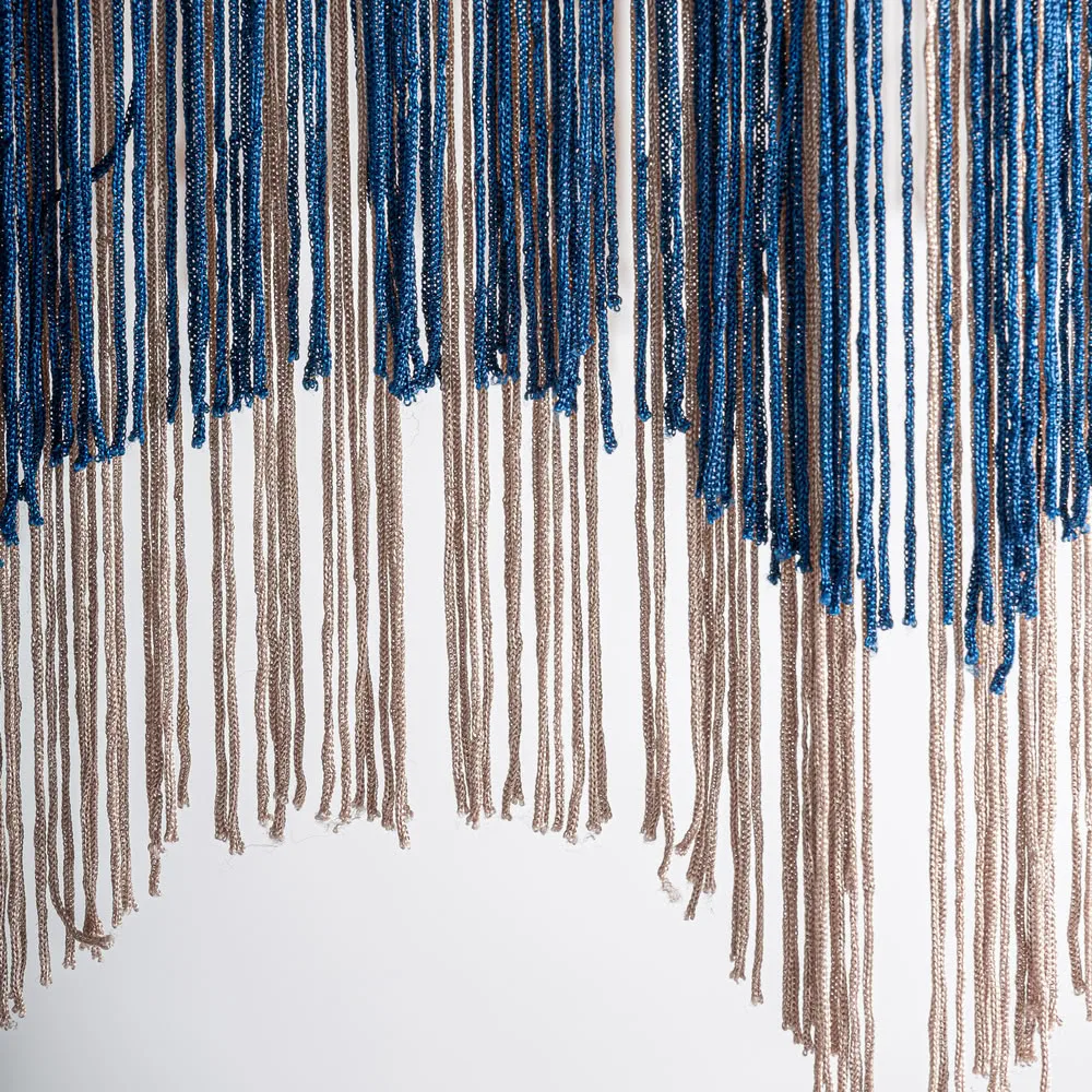 Lámpara de colgar fabricado en yute en color beige combinado con flecos en color azul y hierro en color marrón.
