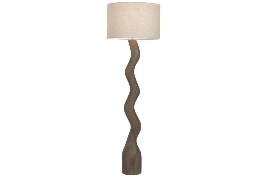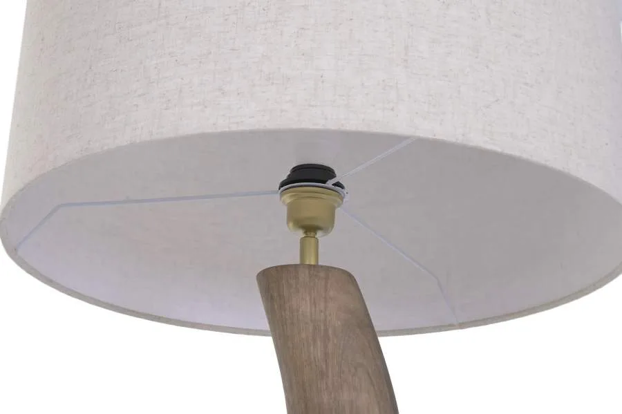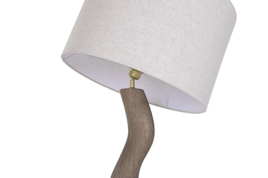 Lámpara de pie con base y fuste de madera de mango en color marrón y pantalla de lino beige. Aunque similar en materiales a su compañera de colección, su altura ligeramente menor la hace algo más contenida visualmente, siendo una opción ideal para espacios donde se busca una lámpara de pie de madera de mango con pantalla de lino que ilumine con calidez sin dominar en exceso el ambiente.