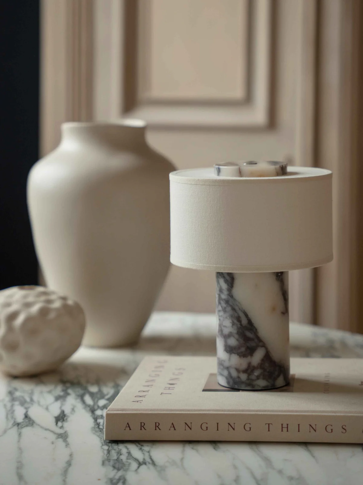 La Lámpara portátil de mármol Calacatta Viola y lino Auríe combina una base de travertino natural con una pantalla de lino crema, creando una luz cálida y envolvente perfecta para cualquier ambiente interior. Su diseño danés, compacto y delicado —24 cm de altura, pantalla de 17,5 cm y base de 8×13 cm— hace que encaje con facilidad en mesitas, estanterías y composiciones decorativas.