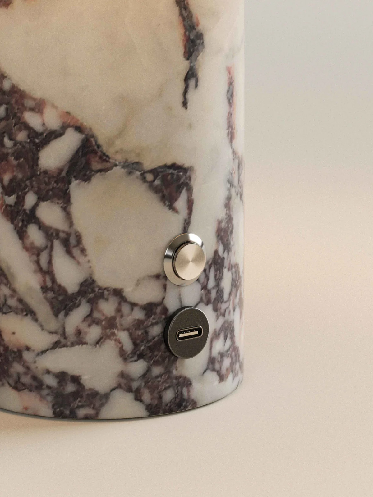 Auríe es una lámpara portátil recargable, equipada con tres niveles de intensidad y una batería de larga duración que permite disfrutar de su luz durante horas. Cada pieza es única gracias a las vetas naturales del mármol Calacatta Viola, aportando carácter y exclusividad a cualquier espacio.