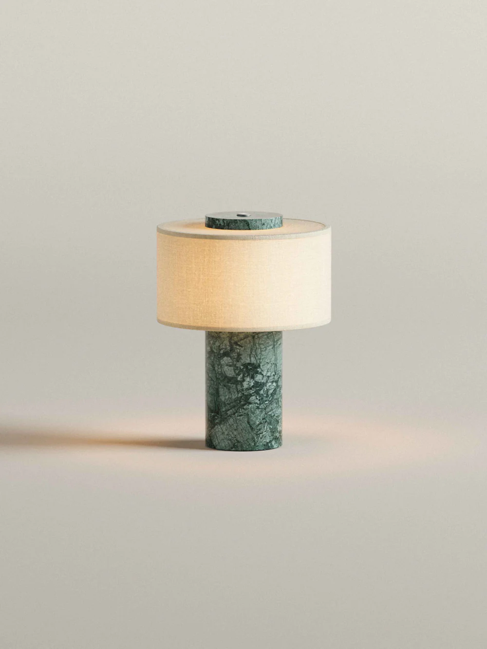 La Lámpara portátil de mármol y lino Auríe combina una base de mármol verde guatemala con una pantalla de lino crema, creando una luz cálida y envolvente perfecta para cualquier ambiente interior. Su diseño danés, compacto y delicado —24 cm de altura, pantalla de 17,5 cm y base de 8×13 cm— hace que encaje con facilidad en mesitas, estanterías y composiciones decorativas.
