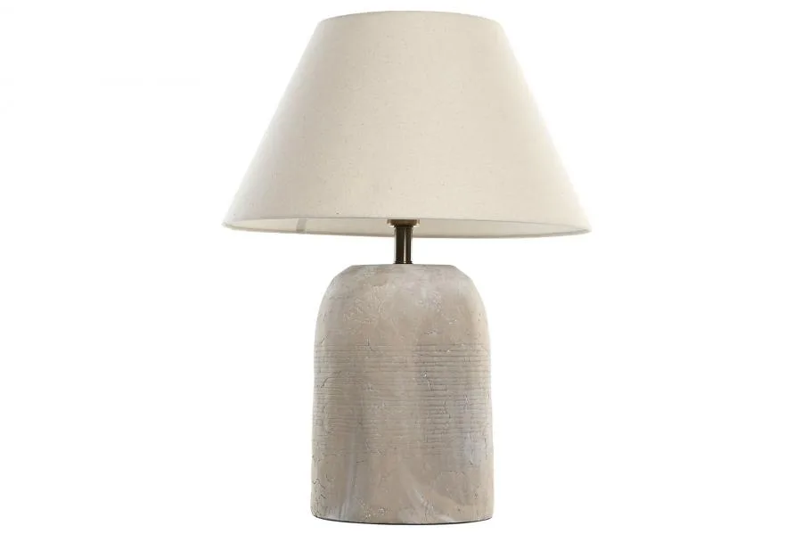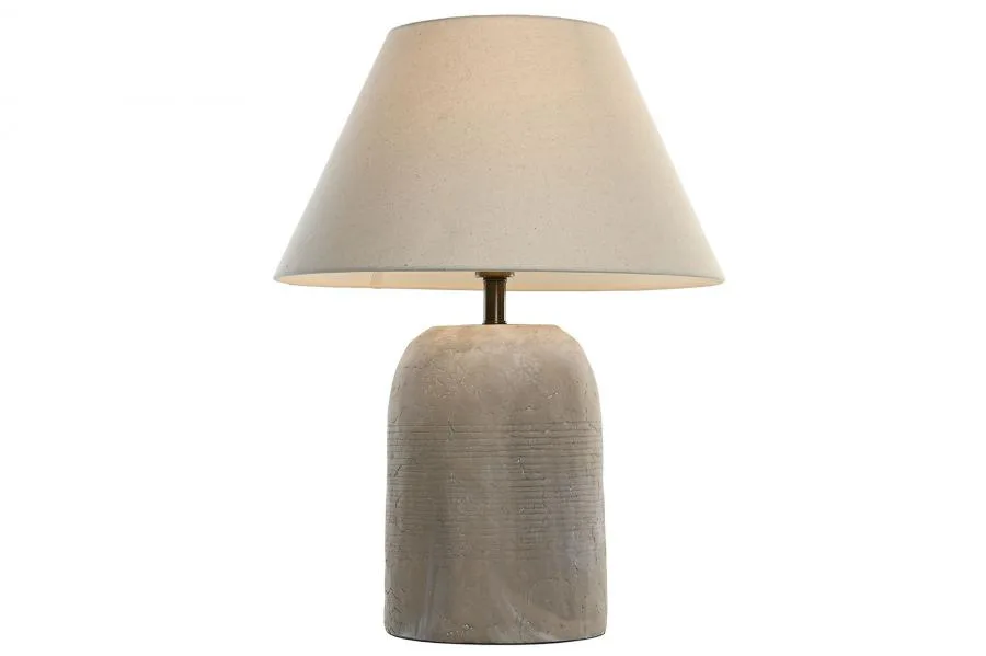 Lámpara de mesa con pie de cemento en color gris y pantalla de poliéster beige, de estética urbana y acabado industrial. El cemento aporta solidez y un carácter contemporáneo que contrasta con la calidez de la pantalla beige, siendo una opción perfecta para salones, estudios y espacios que buscan una lámpara de sobremesa de cemento con un toque moderno y diferente.