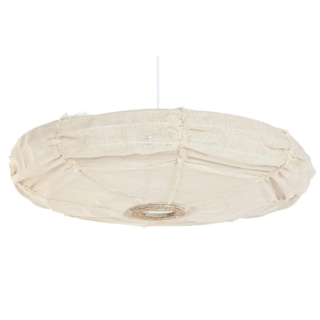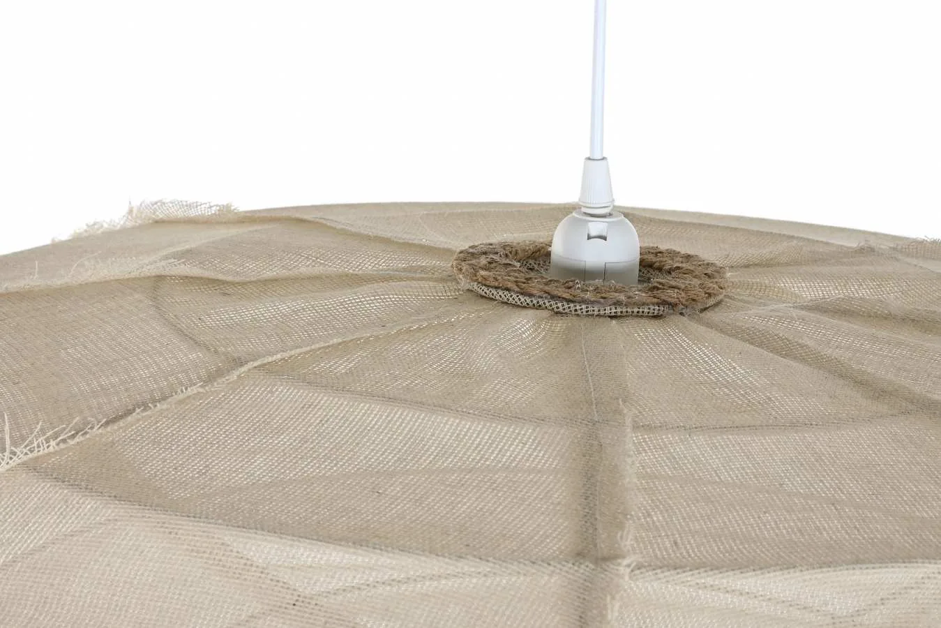 Lámpara de techo de lino y cuerda con estructura metálica en color natural crudo, de perfil plano y gran diámetro. Su diseño minimalista y sus materiales naturales y ecológicos crean una luz difusa y acogedora, siendo una pieza perfecta para salones y comedores mediterráneos con techos bajos que buscan una lámpara de techo de lino natural con mucha presencia y poco volumen.