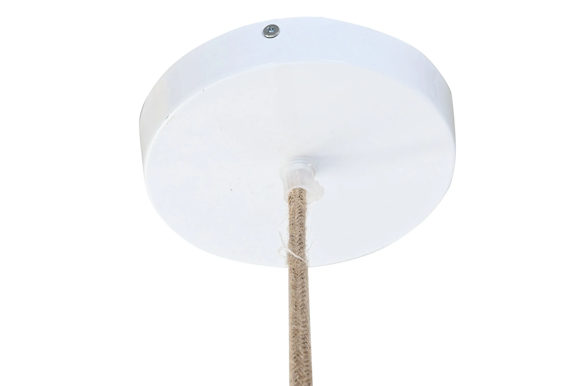 Lámpara de techo de yute y tela con estructura de metal, con pantalla de cuerda trenzada y acabado artesanal. Su textura orgánica y su luz tamizada crean un ambiente cálido y acogedor, siendo una opción perfecta para comedores, salones y dormitorios que buscan una lámpara de techo de yute natural con estructura metálica y un acabado mediterráneo.