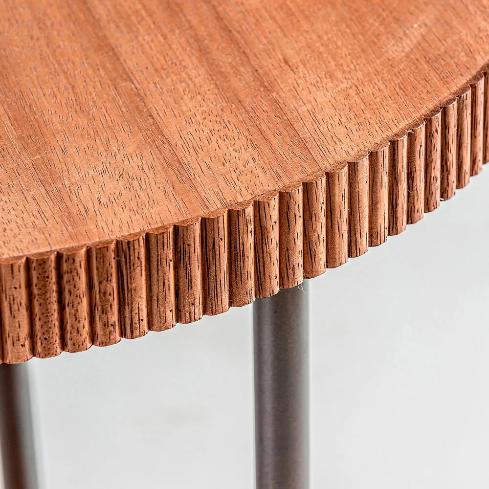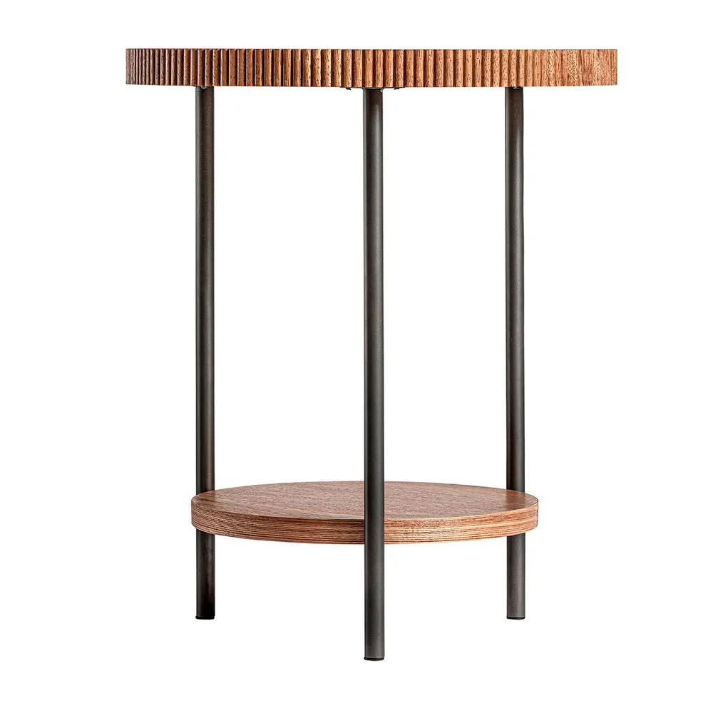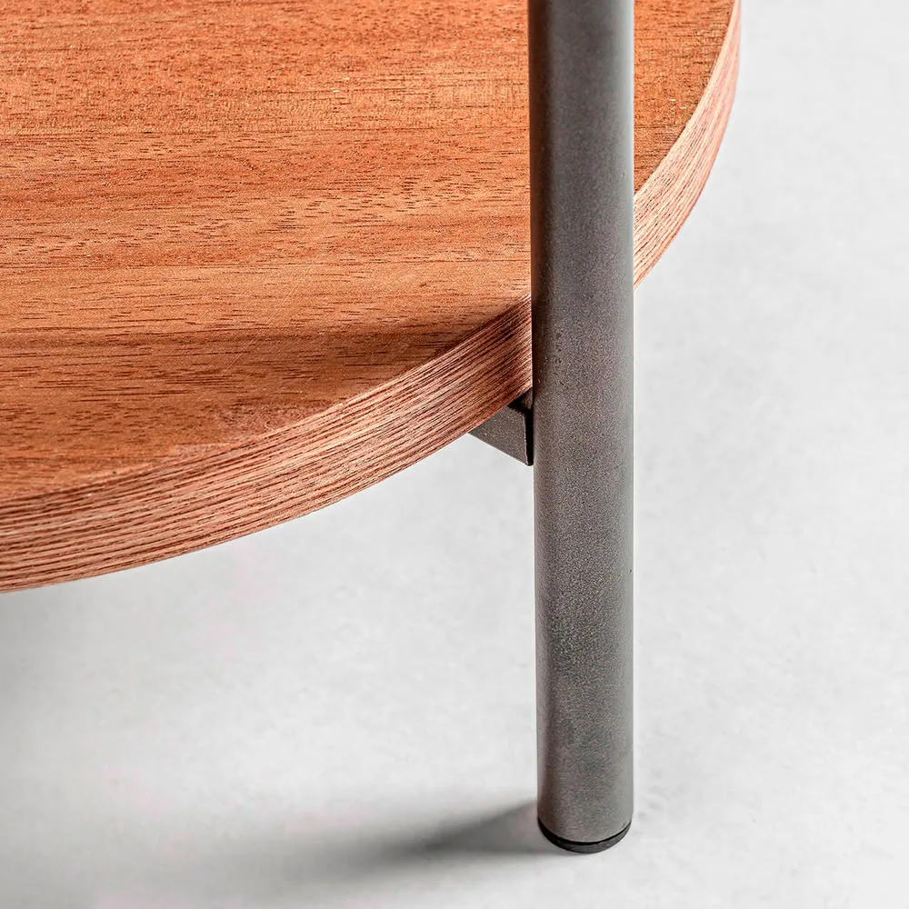 La mesa auxiliar Asroa está elaborada de madera de abeto y hierro. Su estructura metálica se compone de tres patas finas y redondas que sujetan dos tableros, uno en la parte superior y otro en la parte inferior de menor tamaño. Es una pieza muy versátil y atemporal, la cual cosa facilita su combinación con otros muebles de diferentes estilos. Medidas: 51x51x61cm y peso de 7kg.