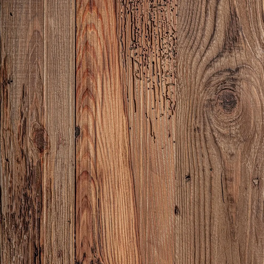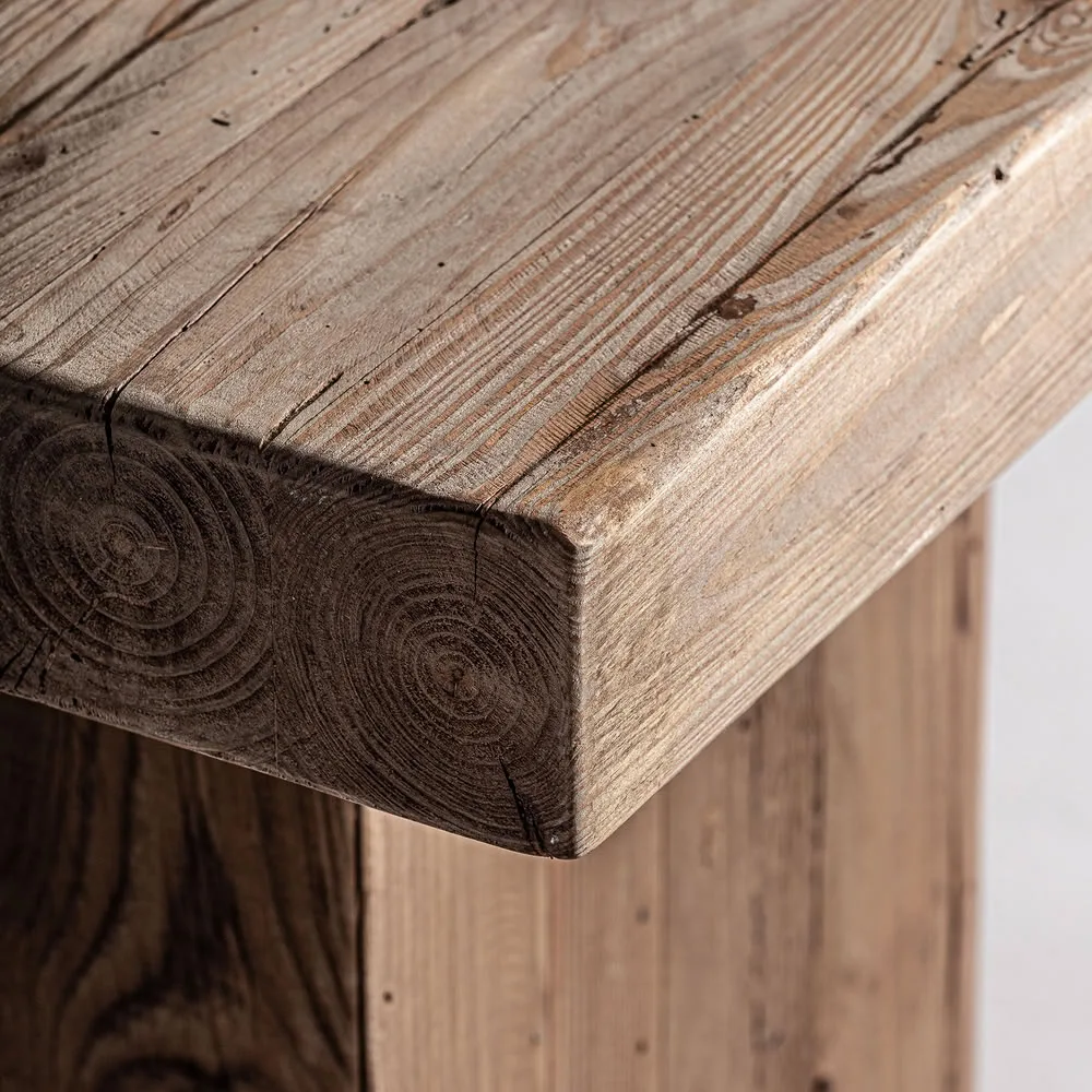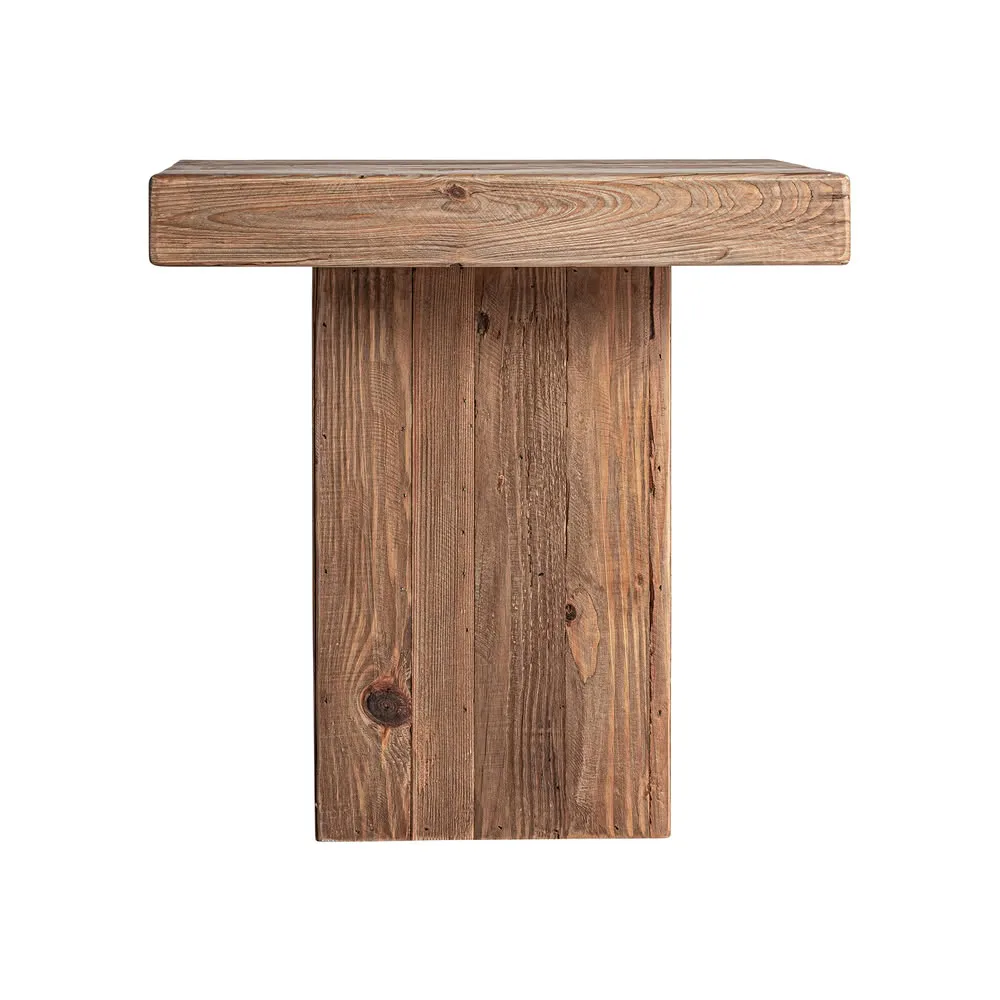 Mesa auxiliar breive de estilo rústico fabricado en madera de pino reciclado en color marrón con acabado envejecido.