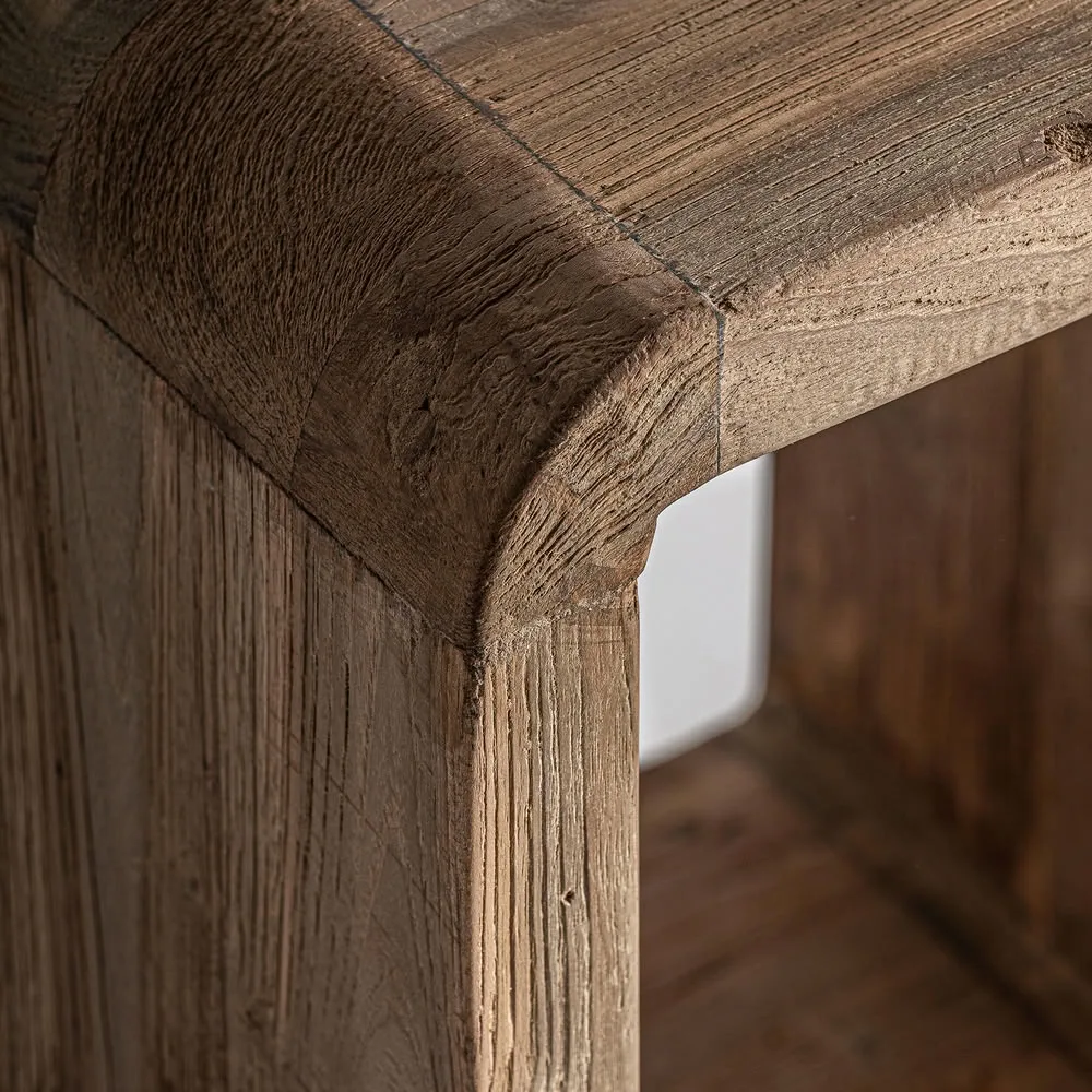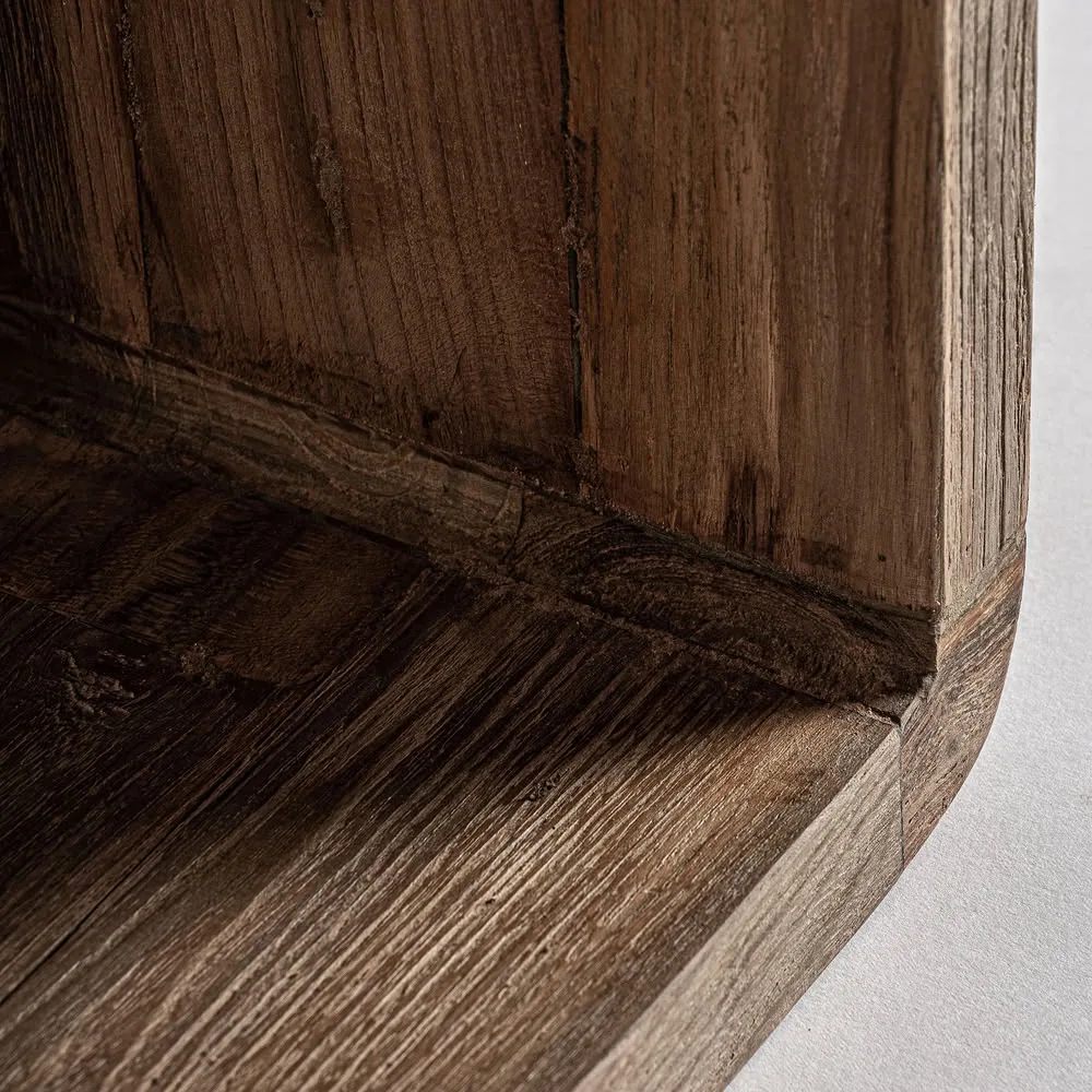 Mesa auxiliar corba de estilo colonial fabricado en madera de teka reciclada en color marrón con acabado natural.