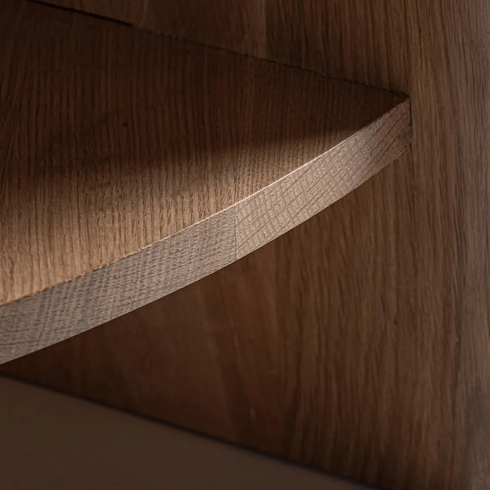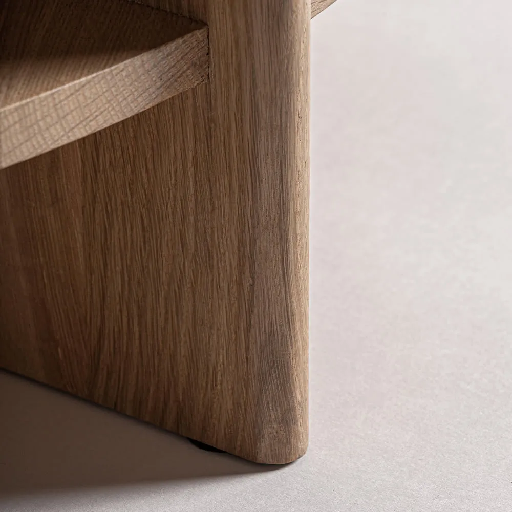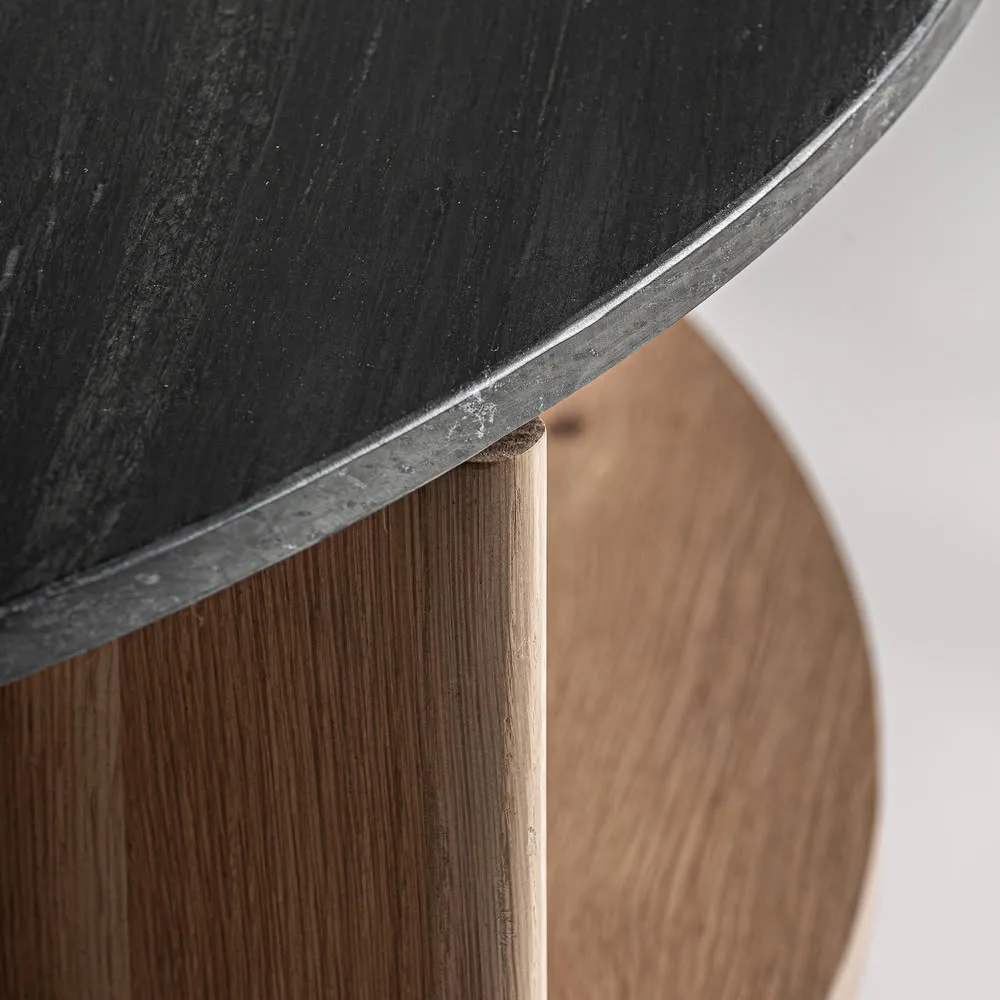 Mesa auxiliar Nara de estilo contemporáneo fabricado en madera roble en color marrón combinado con travertino en color negro. Producto desmontable.