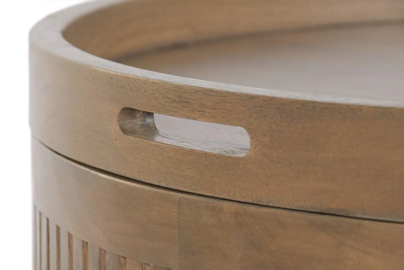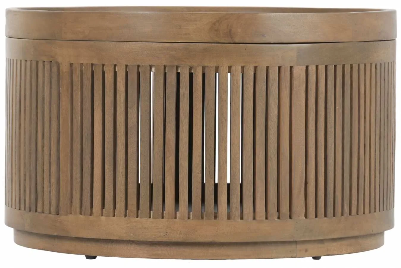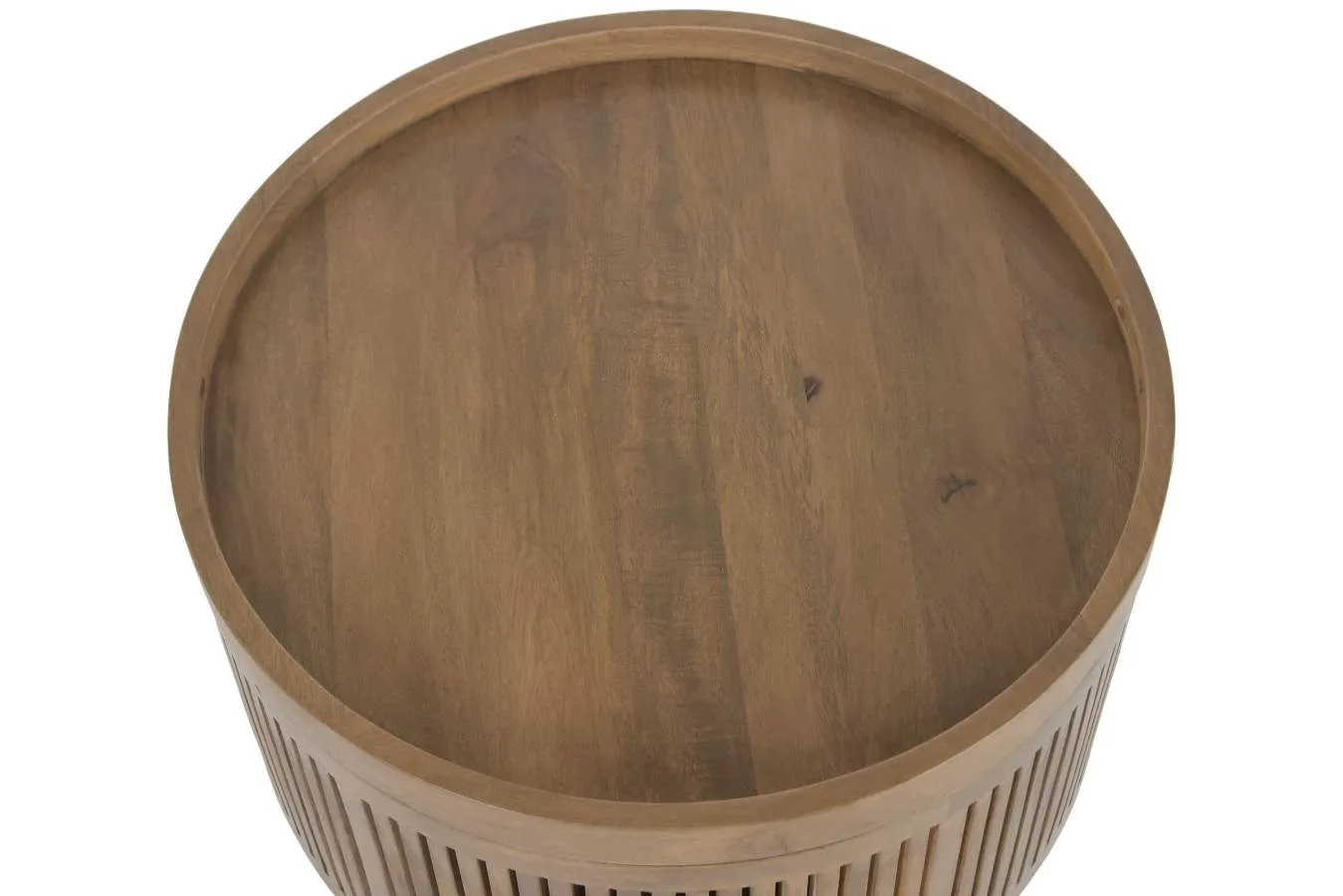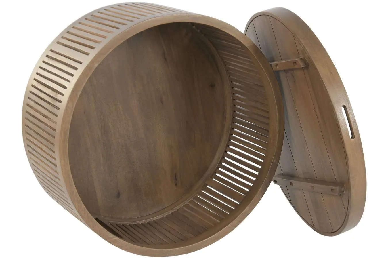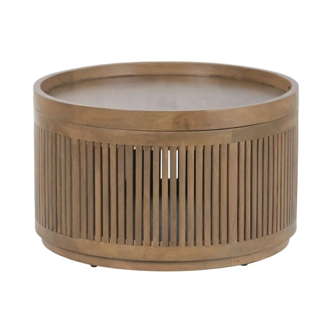 Mesa de centro cuadrada de madera de mango en tono marrón con bandeja superior extraíble que descubre un espacio interior ideal para guardar mantas, cojines u objetos de salón. Una pieza funcional y elegante de estética moderna. Mide 76 cm de lado y 45,5 cm de alto.