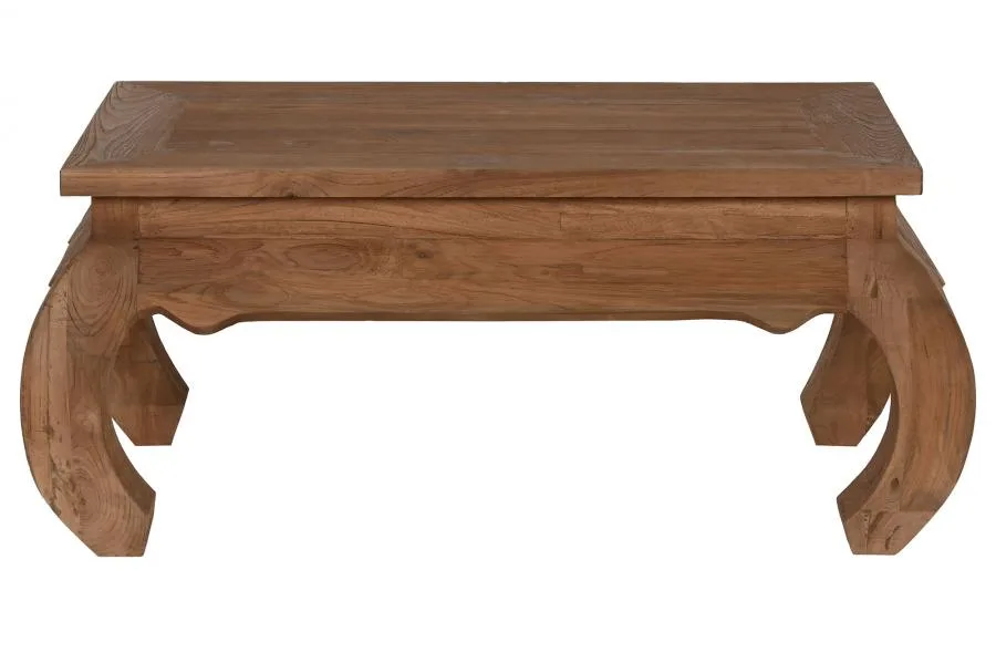 Mesa de centro de teca reciclada en color natural, compacta y con el veteado auténtico propio de la madera con historia. Su formato contenido la hace ideal para salones de tamaño medio que buscan una mesa de centro de madera reciclada sostenible, sólida y con un acabado cálido e irrepetible. Mide 100 cm de largo, 60 cm de ancho y 42 cm de alto.