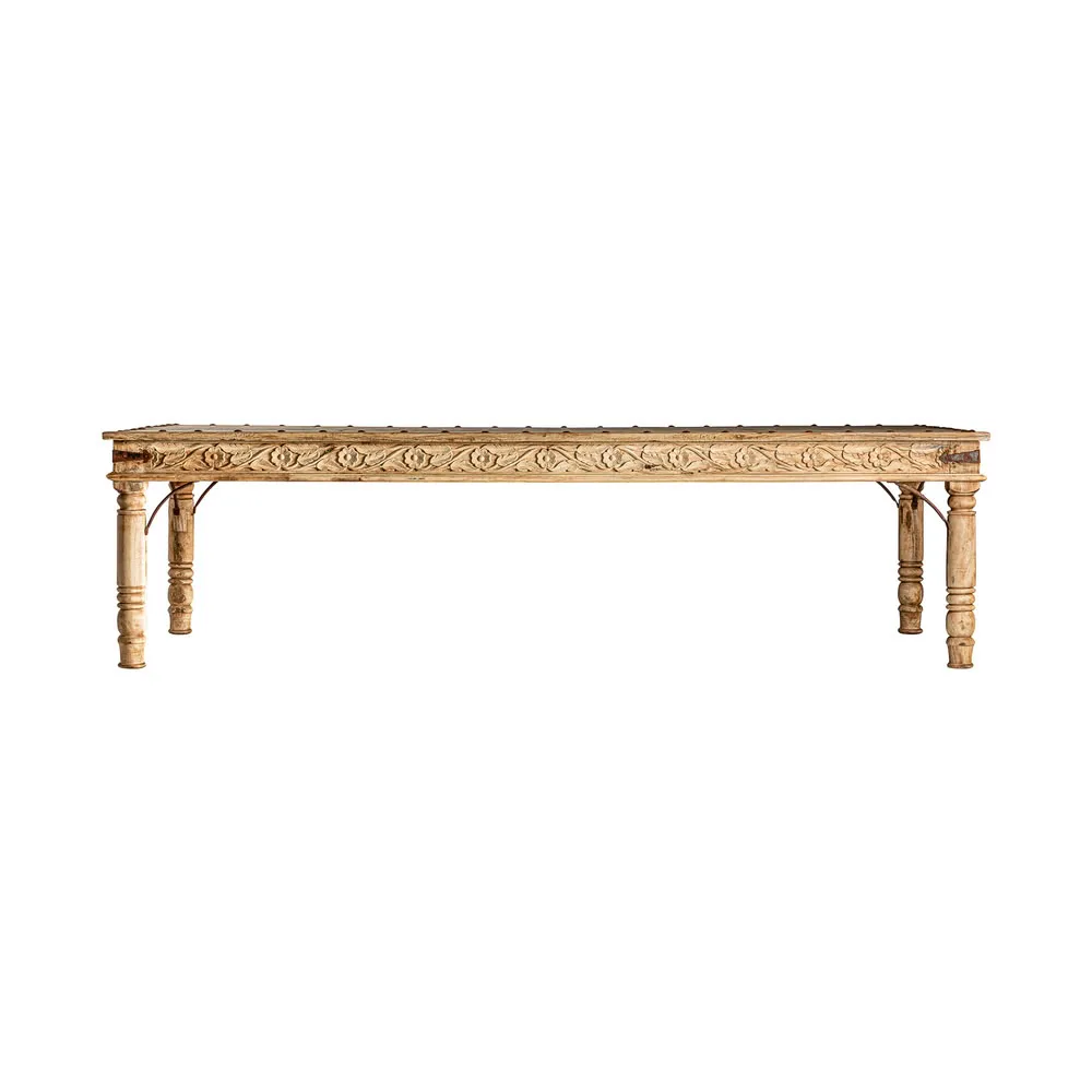 Mesa comedor kalyan de estilo étnico fabricado en madera de mango en color marrón con acabado envejecido.