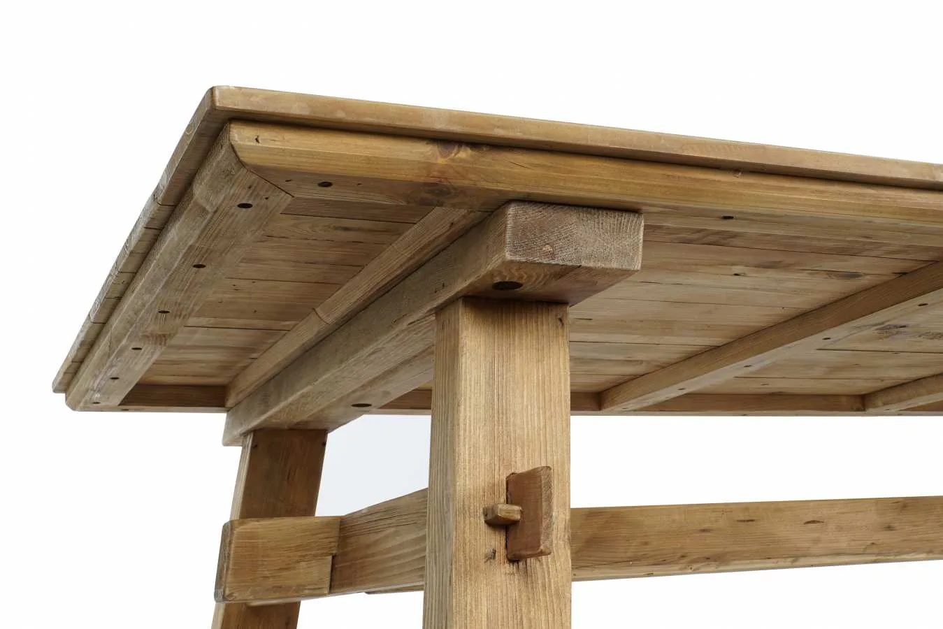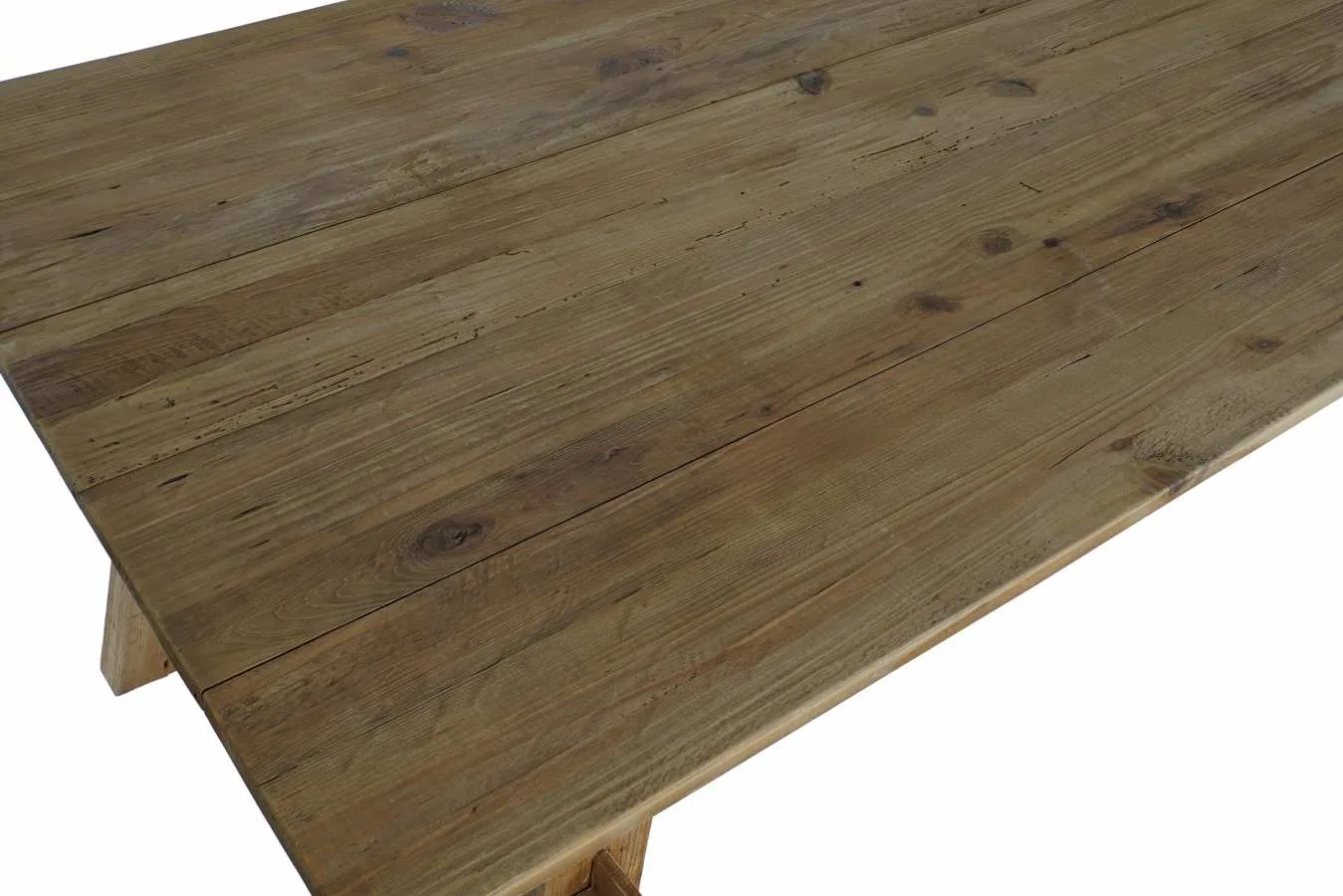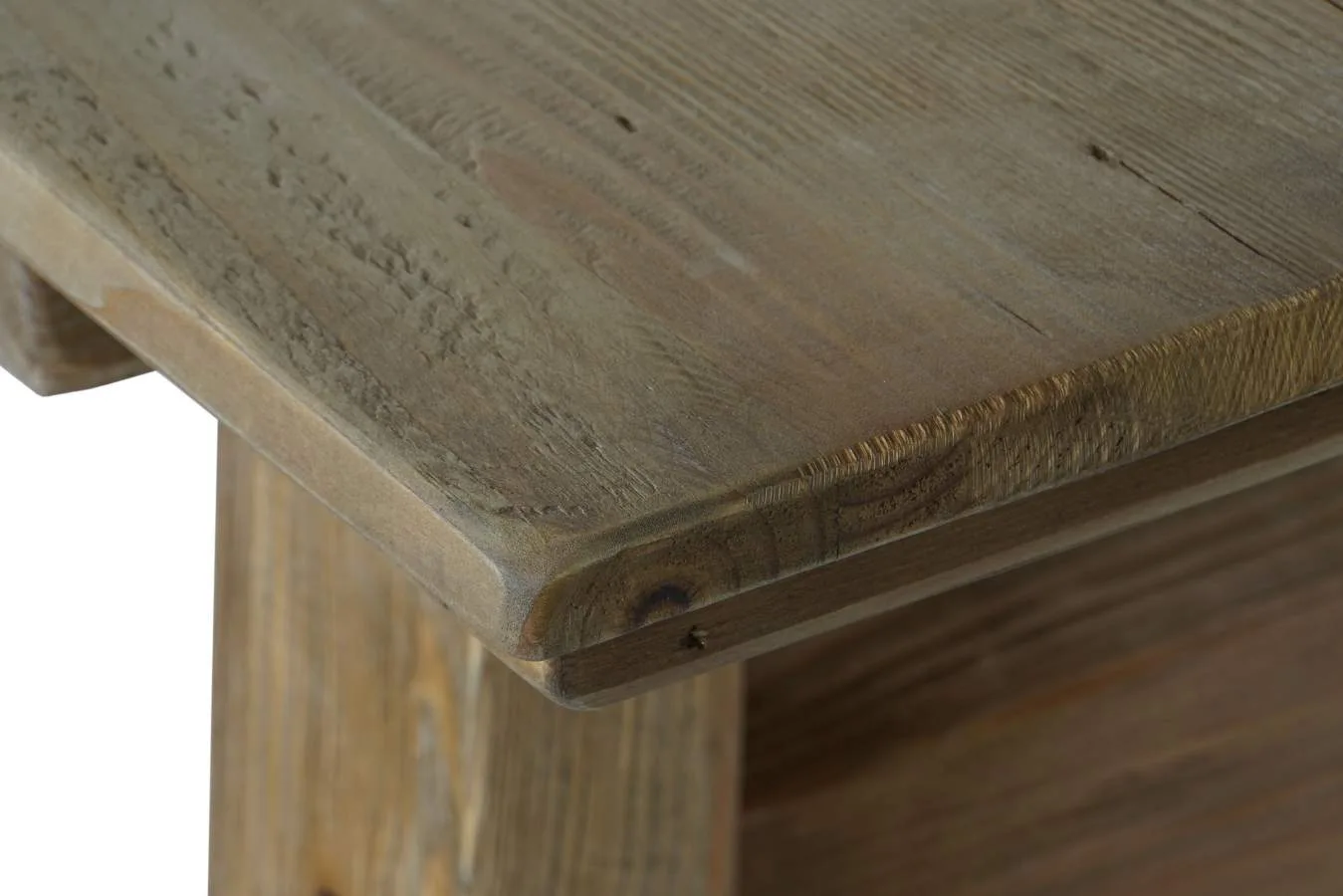 Mesa de comedor rectangular de madera y pino reciclado en color natural, de inspiración alpina y espíritu sostenible. Cada tablón aporta su propio veteado y marcas naturales, dando como resultado una mesa de comedor de madera reciclada única e irrepetible, perfecta para comedores que valoran los materiales con historia y una estética rústica y auténtica. Mide 220 cm de largo, 100 cm de ancho y 76 cm de alto.