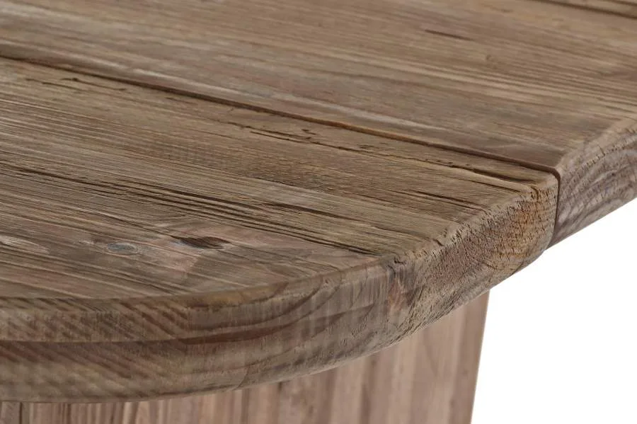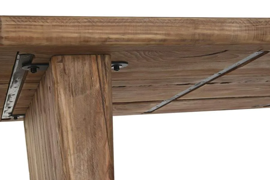 Mesa de comedor de madera reciclada y pino en color natural, donde cada tablón trae consigo su propio veteado, nudos y marcas que hacen de cada pieza algo genuinamente único. Una apuesta clara por la sostenibilidad y la autenticidad para comedores de inspiración alpina que prefieren los materiales con historia a los acabados uniformes de serie. Mide 180 cm de largo, 90 cm de ancho y 77 cm de alto.