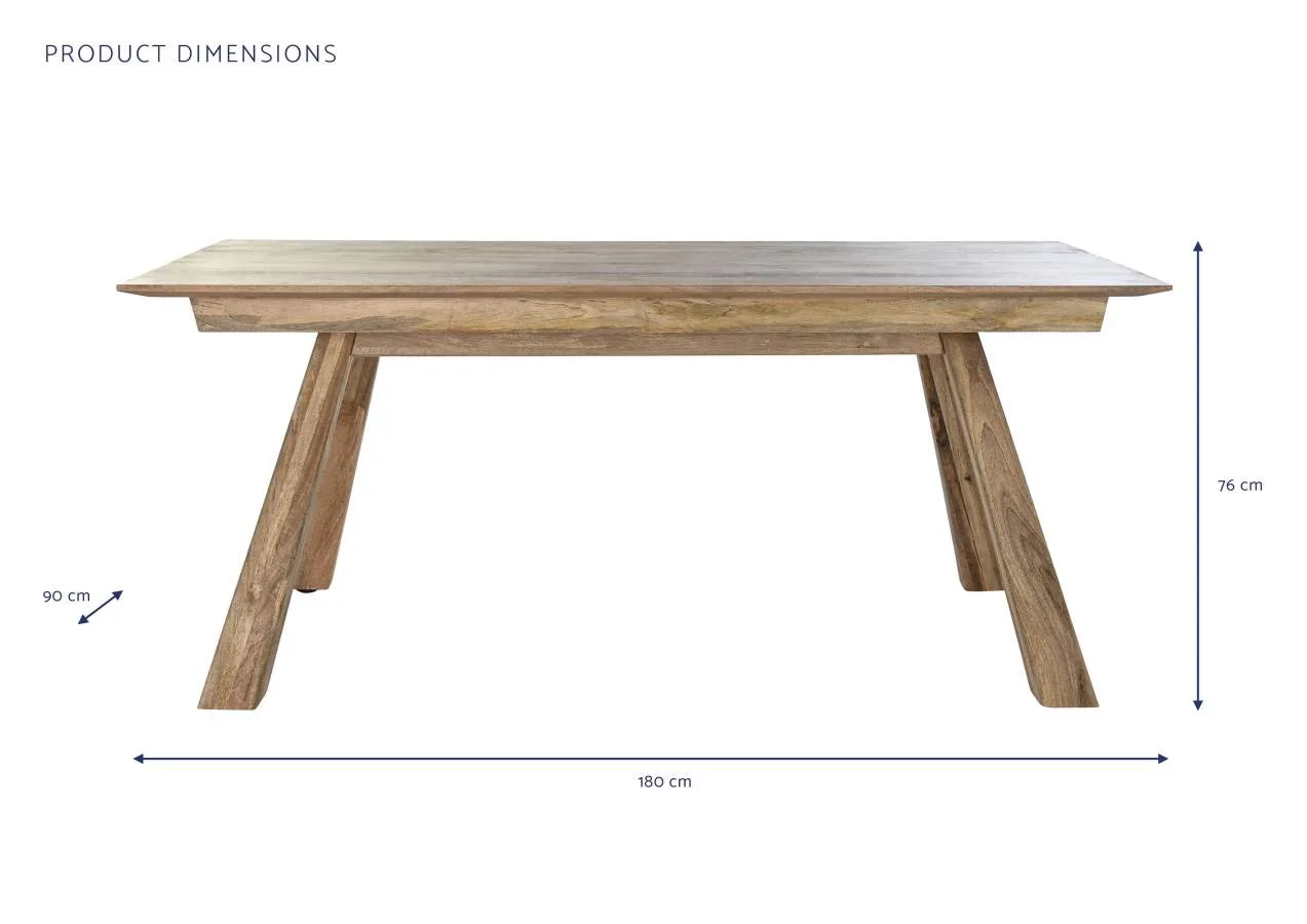 Mesa de comedor de mango macizo en color natural, sencilla y sin artificios. Sus líneas limpias y su acabado cálido la convierten en una pieza fácil de combinar con sillas de distintos estilos, siendo una base perfecta para comedores de inspiración alpina o nórdica que buscan una mesa de comedor de madera maciza natural fiable y duradera. Mide 180 cm de largo, 90 cm de ancho y 76 cm de alto.
