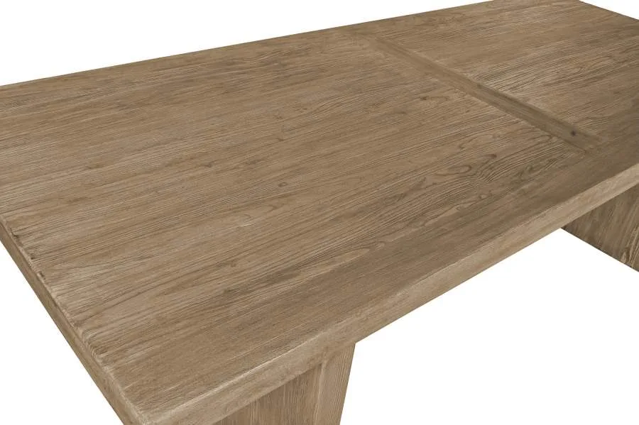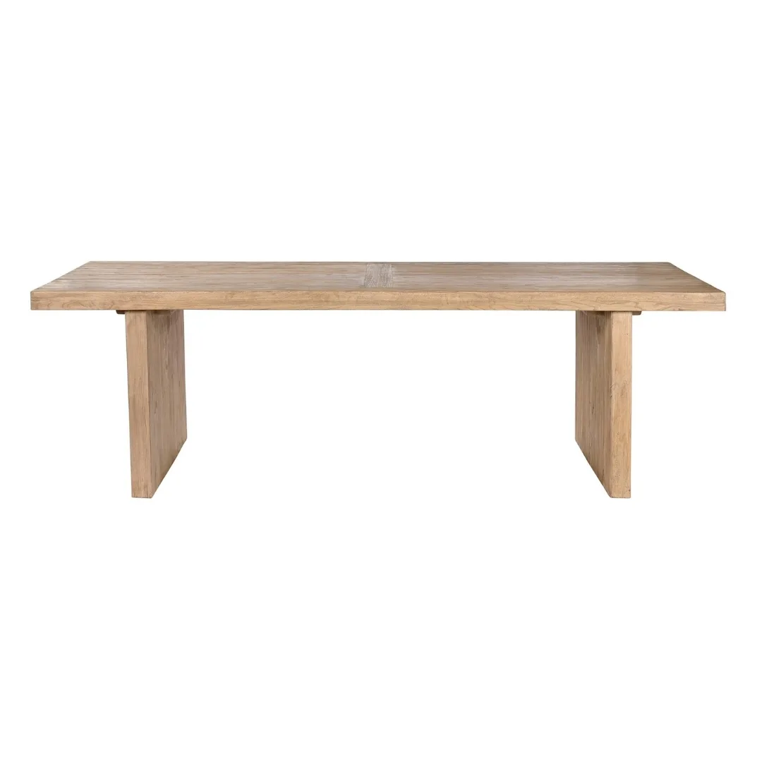 Mesa de comedor rectangular de olmo macizo en color natural con acabado de inspiración china antigua. Su tablero de gran formato y la solidez característica del olmo macizo la convierten en una pieza de presencia y larga durabilidad para grandes comedores que buscan una mesa de comedor de madera maciza con carácter oriental y un acabado cálido y atemporal. Mide 244 cm de largo, 102 cm de ancho y 76 cm de alto.