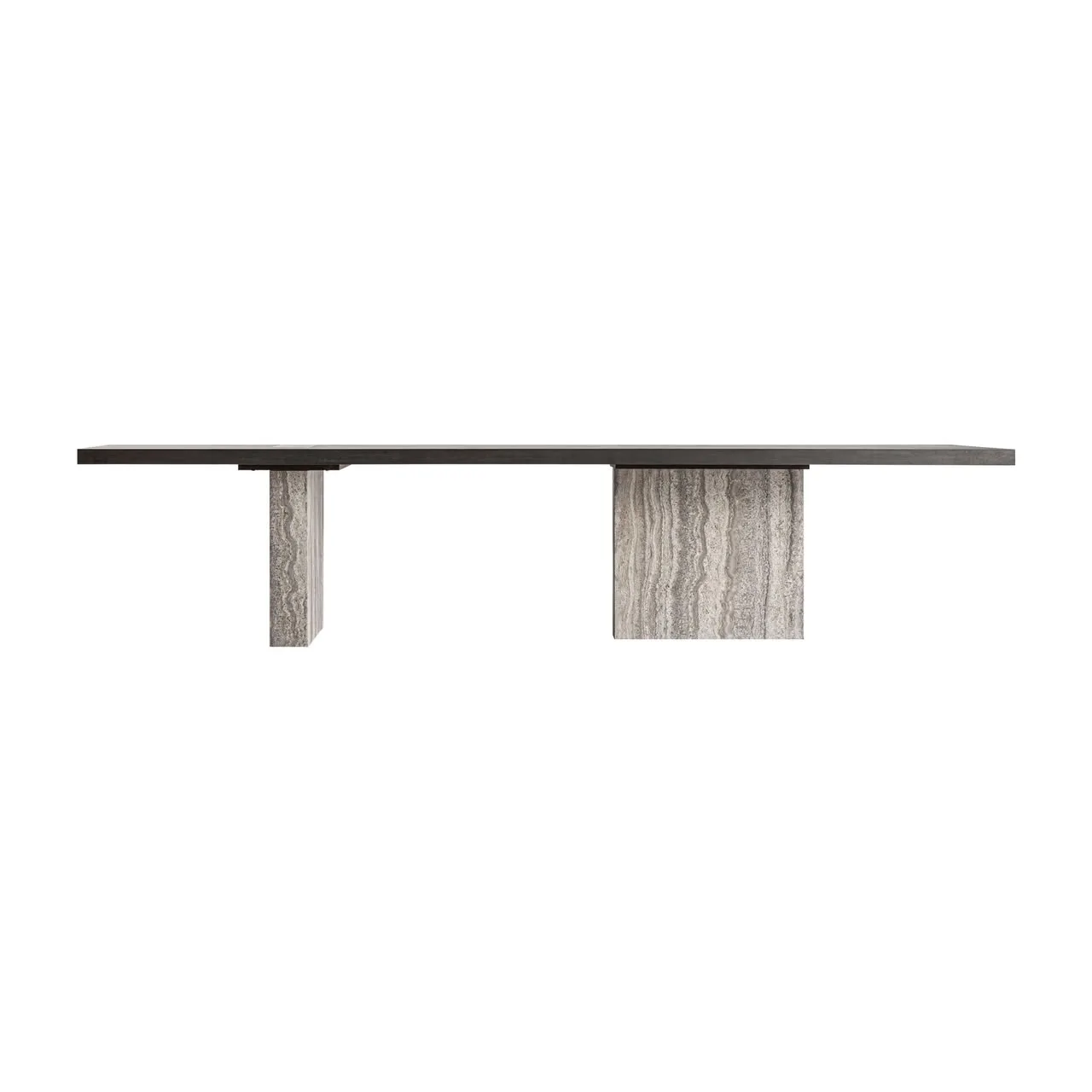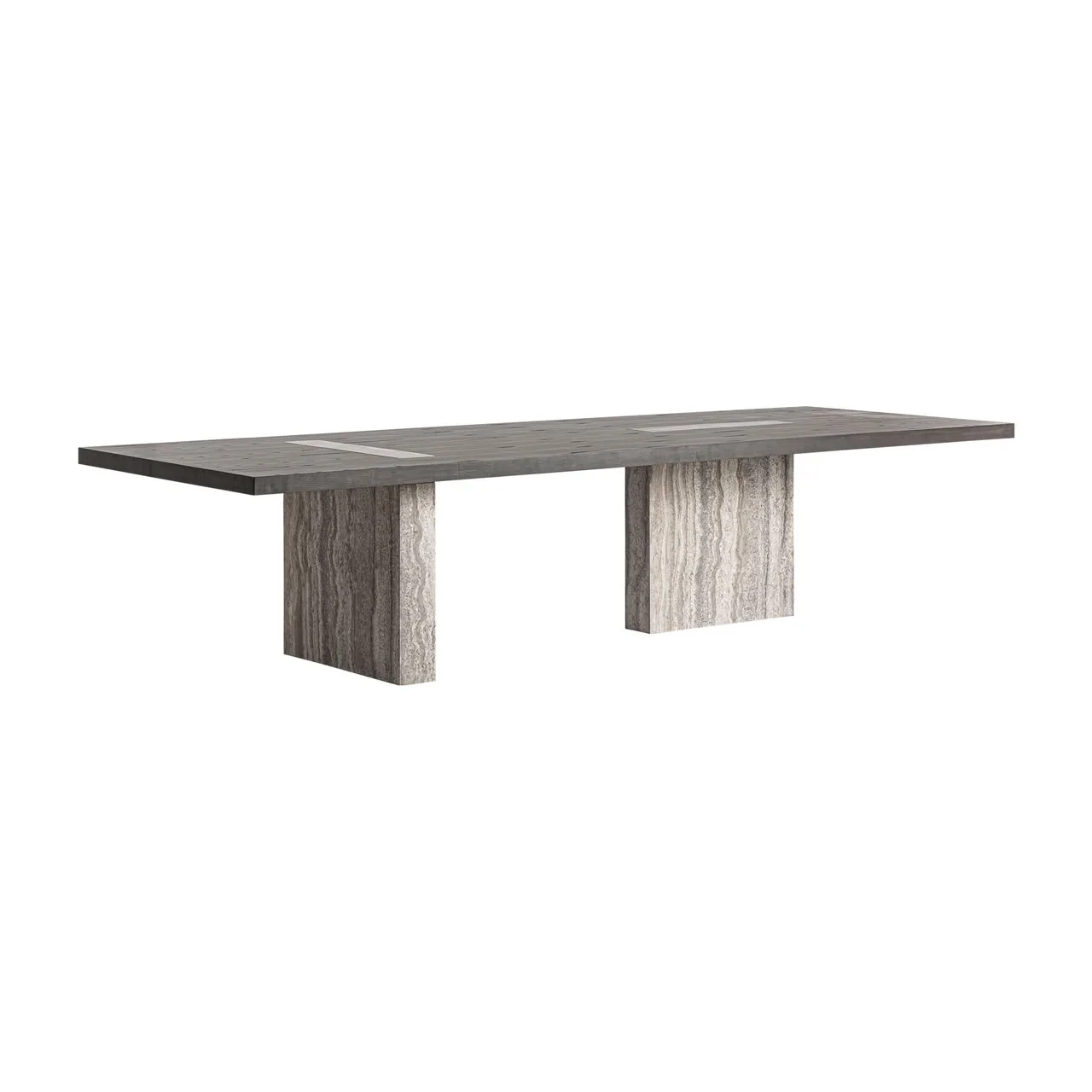 Mesa comedor Rignac de estilo contemporáneo, fabricado en travertino en color gris, combinado con madera de fresno en color marrón y latón. Producto desmontable.