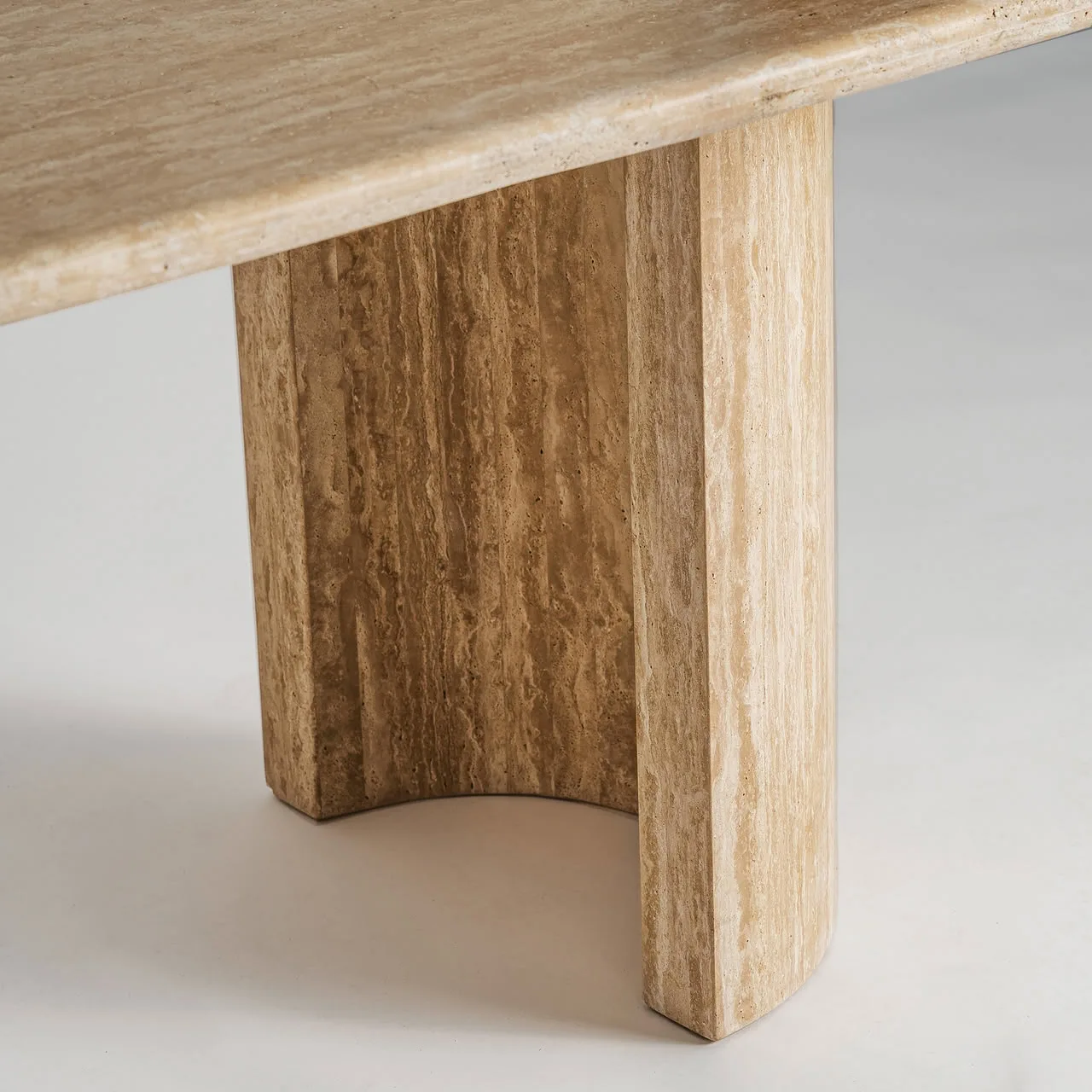 Mesa comedor thiennes de estilo art deco, fabricado en travertino en color marrón claro. Producto desmontable.