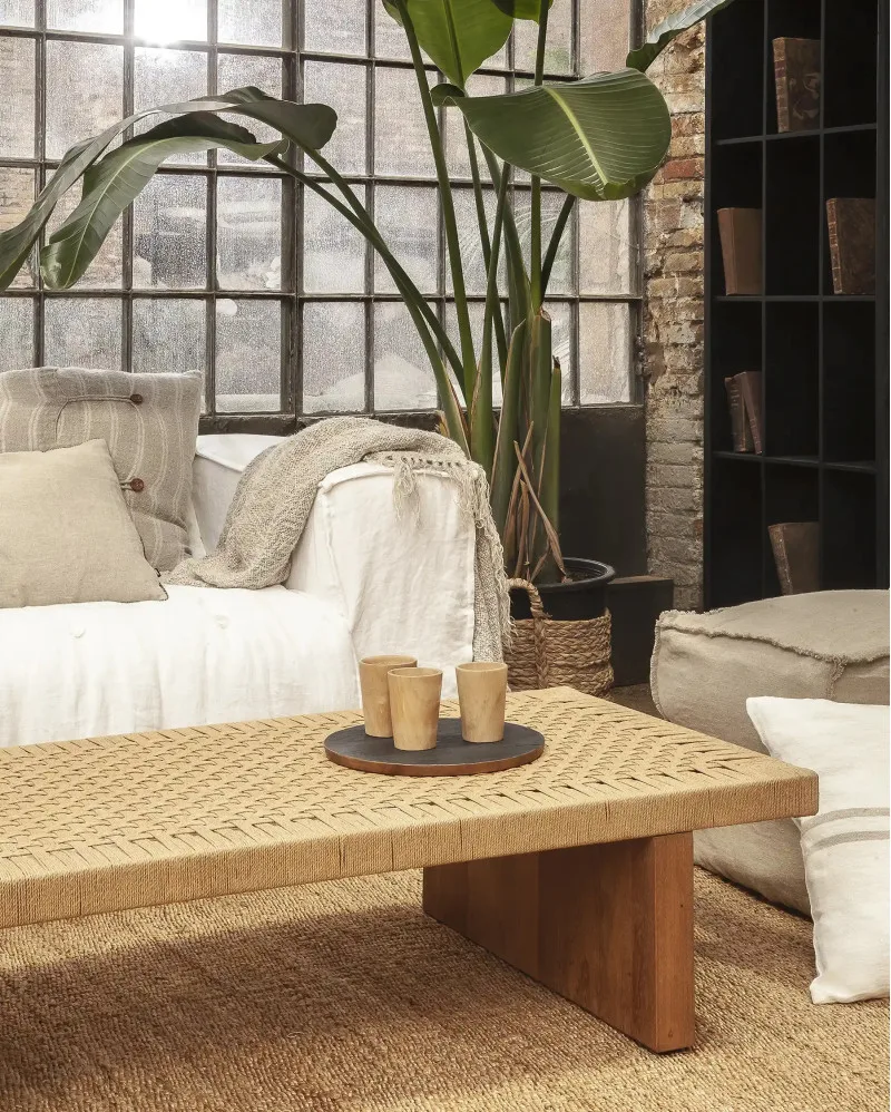 Mesa de centro CORA fabricada con patas de teca reciclada y sobre de cuerda de papel trenzada, con unas dimensiones de 150 × 70 × 35 cm, ideal para salones amplios y composiciones elegantes.