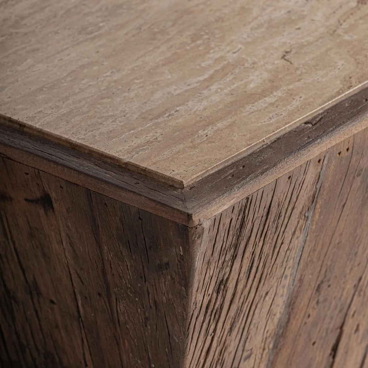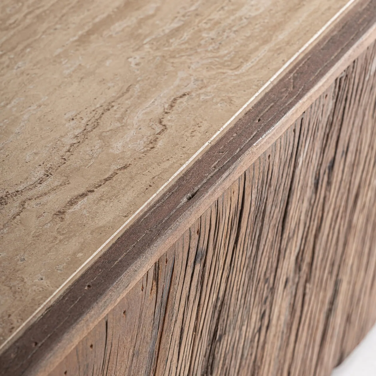 Mesa de centro rústica de madera y travertino Merkem de estilo rústico fabricado en madera recuperada en color marrón con acabado envejecido combinado con travertino en color beige con acabado satinado.