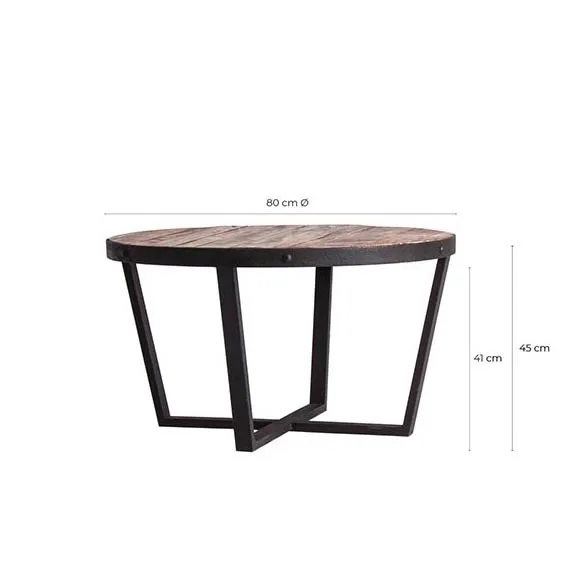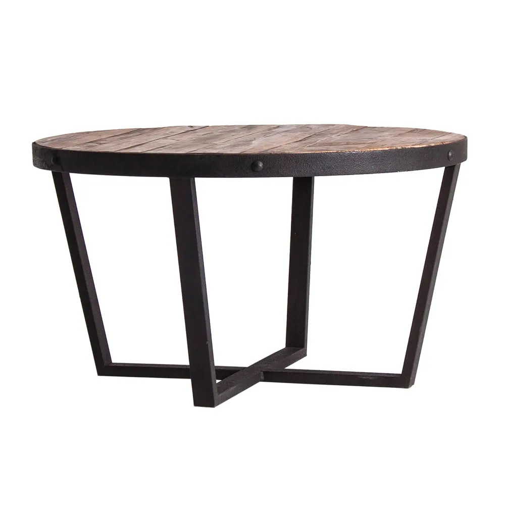 Estética industrial con alma reciclada. La mesa Minot, de forma redonda, combina estructura metálica con sobre de pino reciclado en tono marrón envejecido.