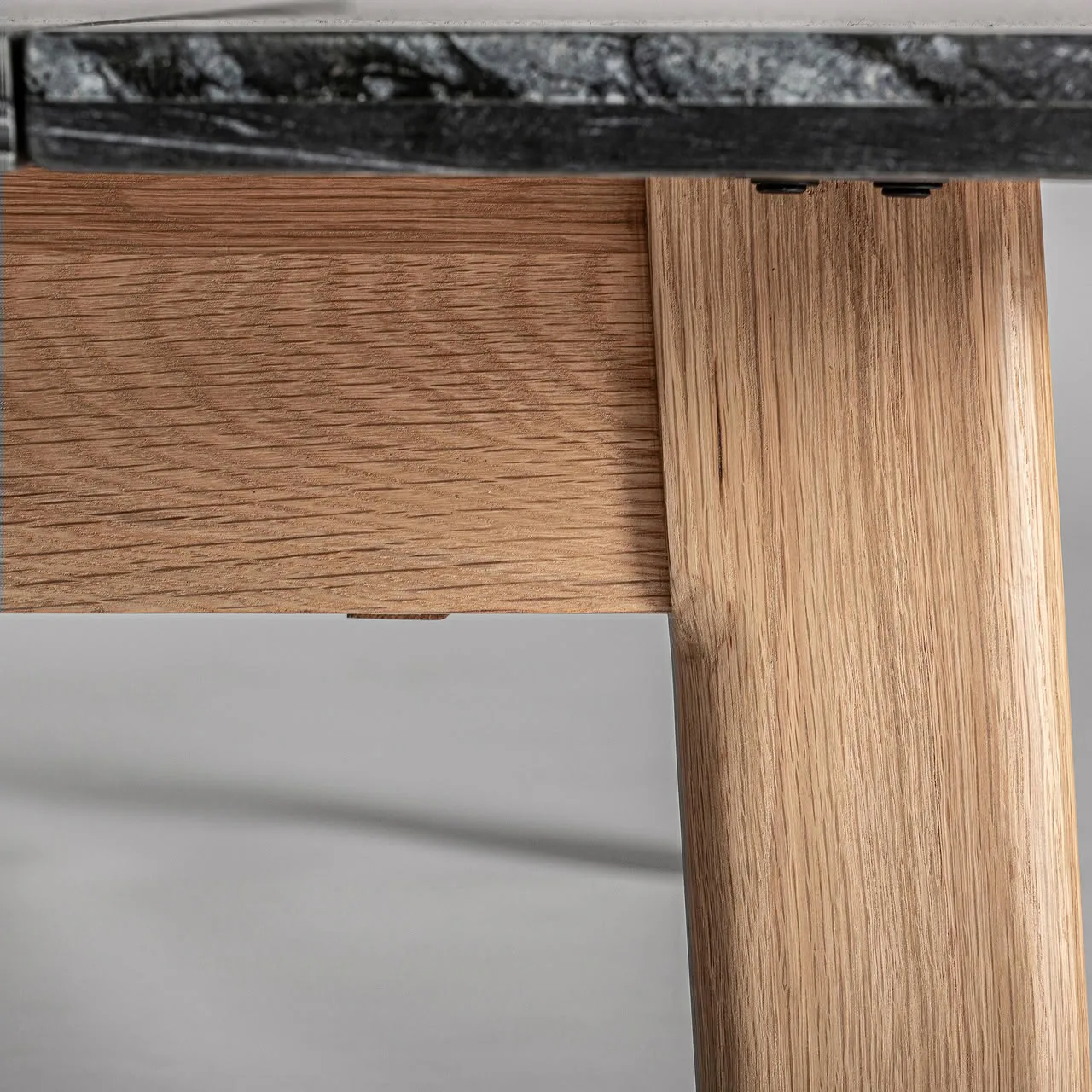Mesa de centro Nara de estilo contemporáneo, fabricado en mármol en color negro, combinado con madera roble en color marrón claro.