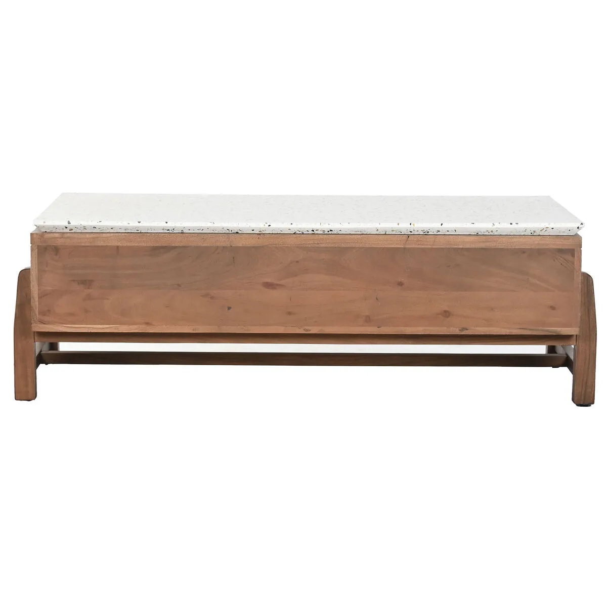 La mesa de centro de acacia y terrazo 127×67×47 cm destaca por el equilibrio entre materiales naturales y diseño contemporáneo. La combinación de madera de acacia y terrazo aporta contraste, textura y un marcado carácter decorativo al salón.