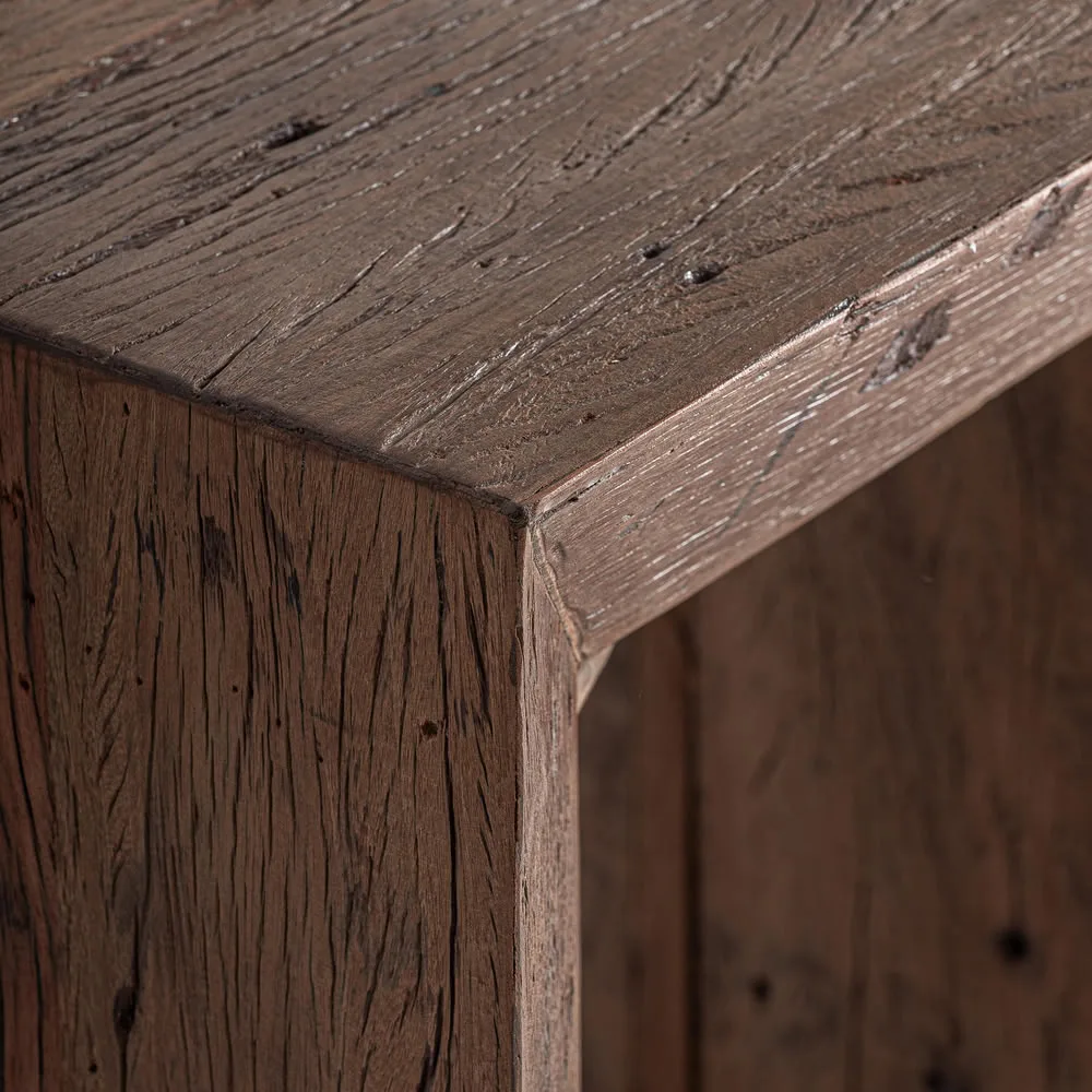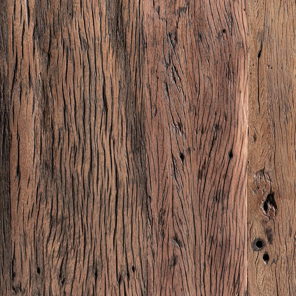 Mesa de centro fabricado en madera recuperada en color marrón.