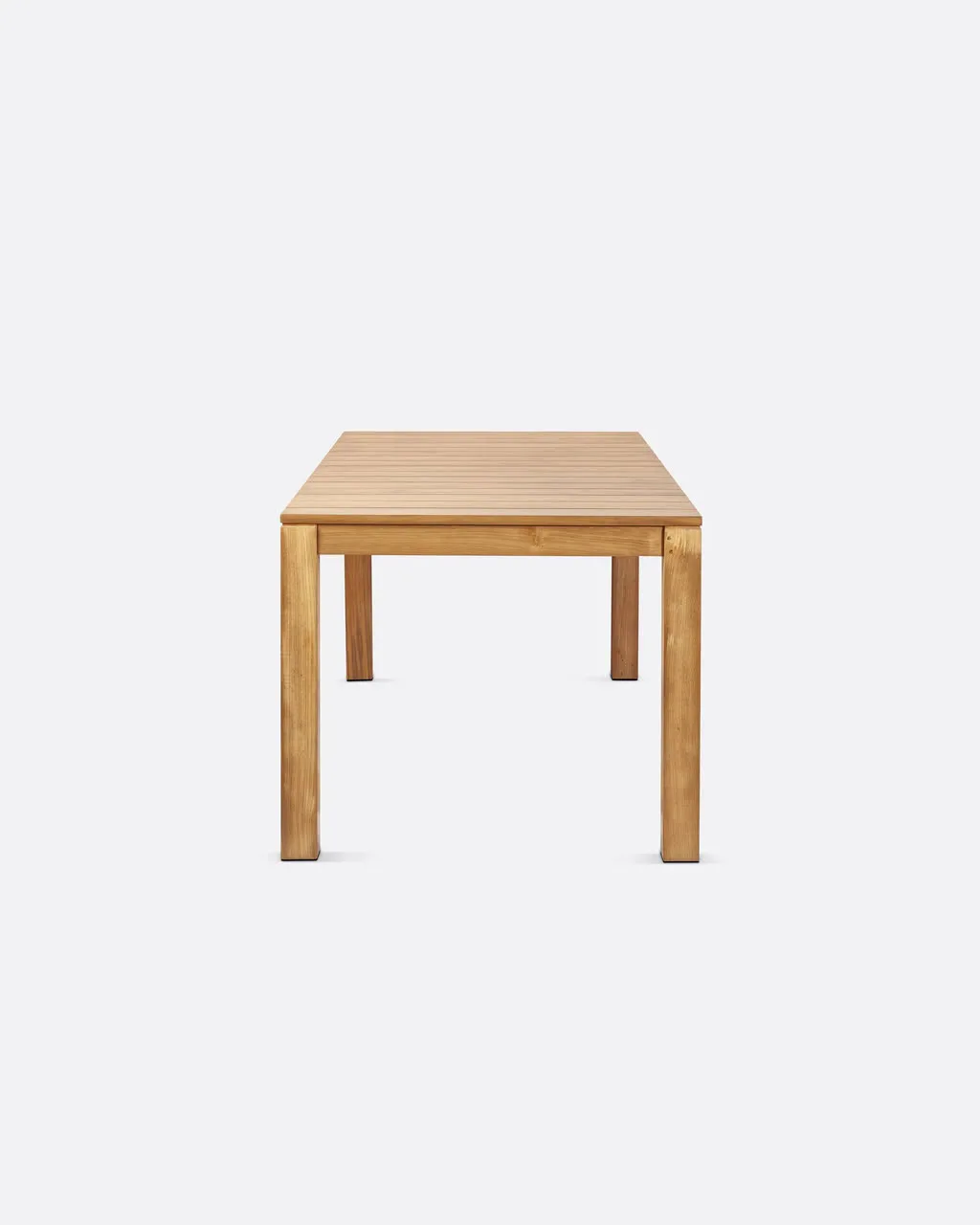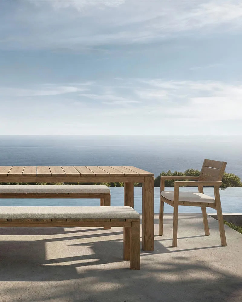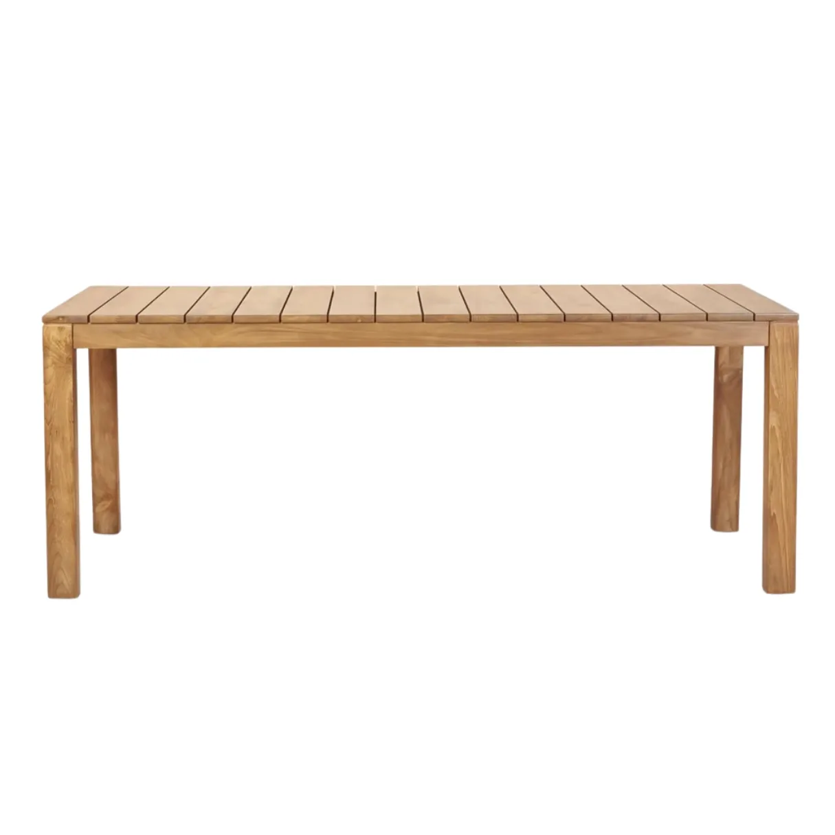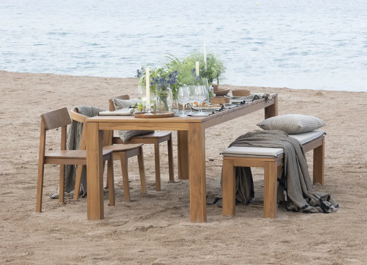 Mesa de comedor de exterior en madera de teca —200 x 90 x 76 cm—, de líneas limpias y diseño atemporal. Una pieza sólida y versátil que aporta calidez natural y elegancia a cualquier espacio.