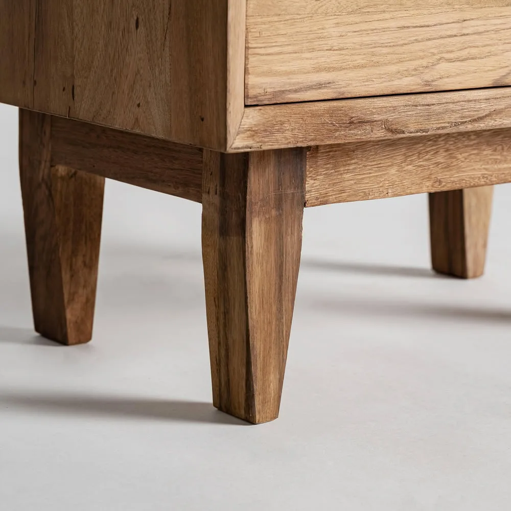 La mesita de noche Cotard aporta calma y autenticidad al dormitorio gracias a su fabricación en madera recuperada. Su estética de inspiración nórdica y su acabado marrón claro realzan la veta natural, dando lugar a una pieza funcional y equilibrada que transmite serenidad. Al tratarse de una fabricación artesanal, cada unidad es única y presenta matices propios que refuerzan su carácter natural.