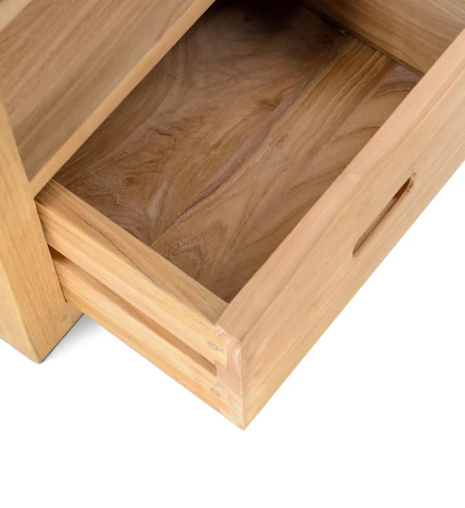 La Mesita flotante Teide de teca 1 cajón y 1 hueco 40 x 40 cm es una solución práctica y elegante para dormitorios que buscan ligereza visual y funcionalidad. Fabricada artesanalmente en madera maciza de teca, combina un diseño compacto con un cajón y un hueco abierto que permiten organizar objetos esenciales sin recargar el espacio. Su acabado natural y las variaciones propias del trabajo manual hacen de cada pieza un elemento único, ideal para ambientes contemporáneos, naturales o mediterráneos.