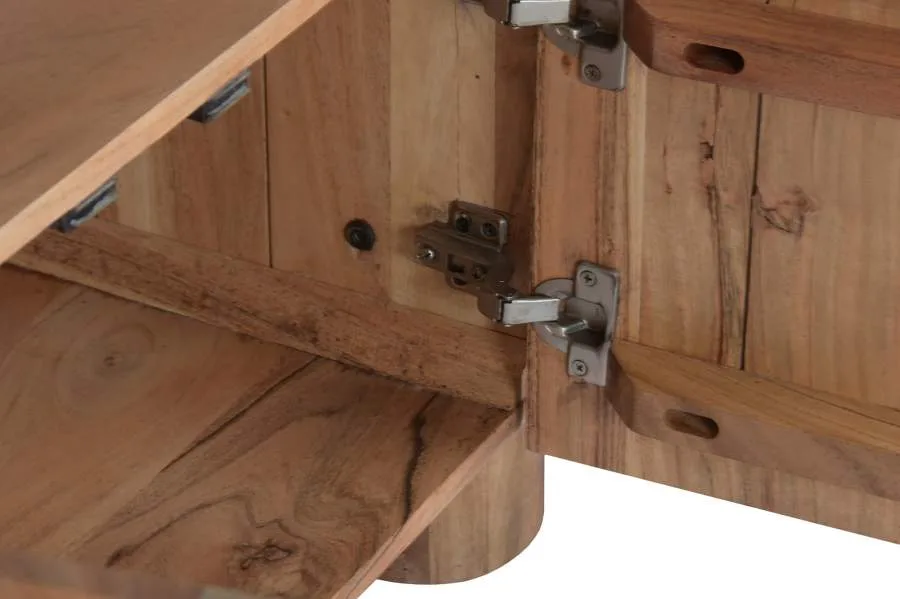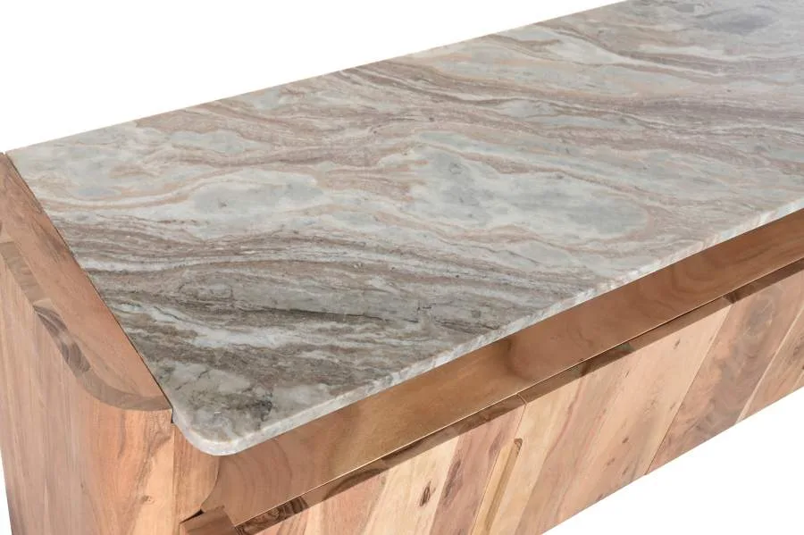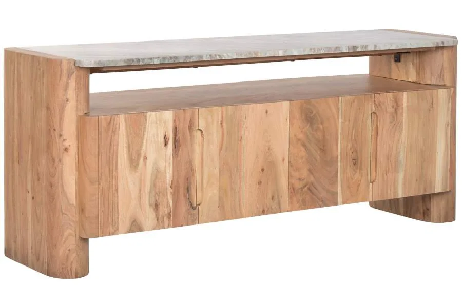 Mueble de televisión de madera de acacia con tablero de mármol, una combinación de materiales naturales que aporta sofisticación y calidez a cualquier salón. Su diseño elegante y atemporal lo convierte en una pieza protagonista. Mide 150 cm de ancho, 40 cm de fondo y 60 cm de alto.