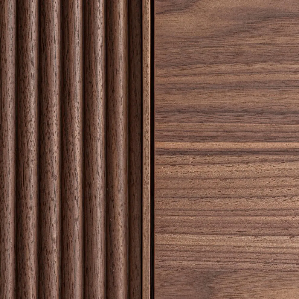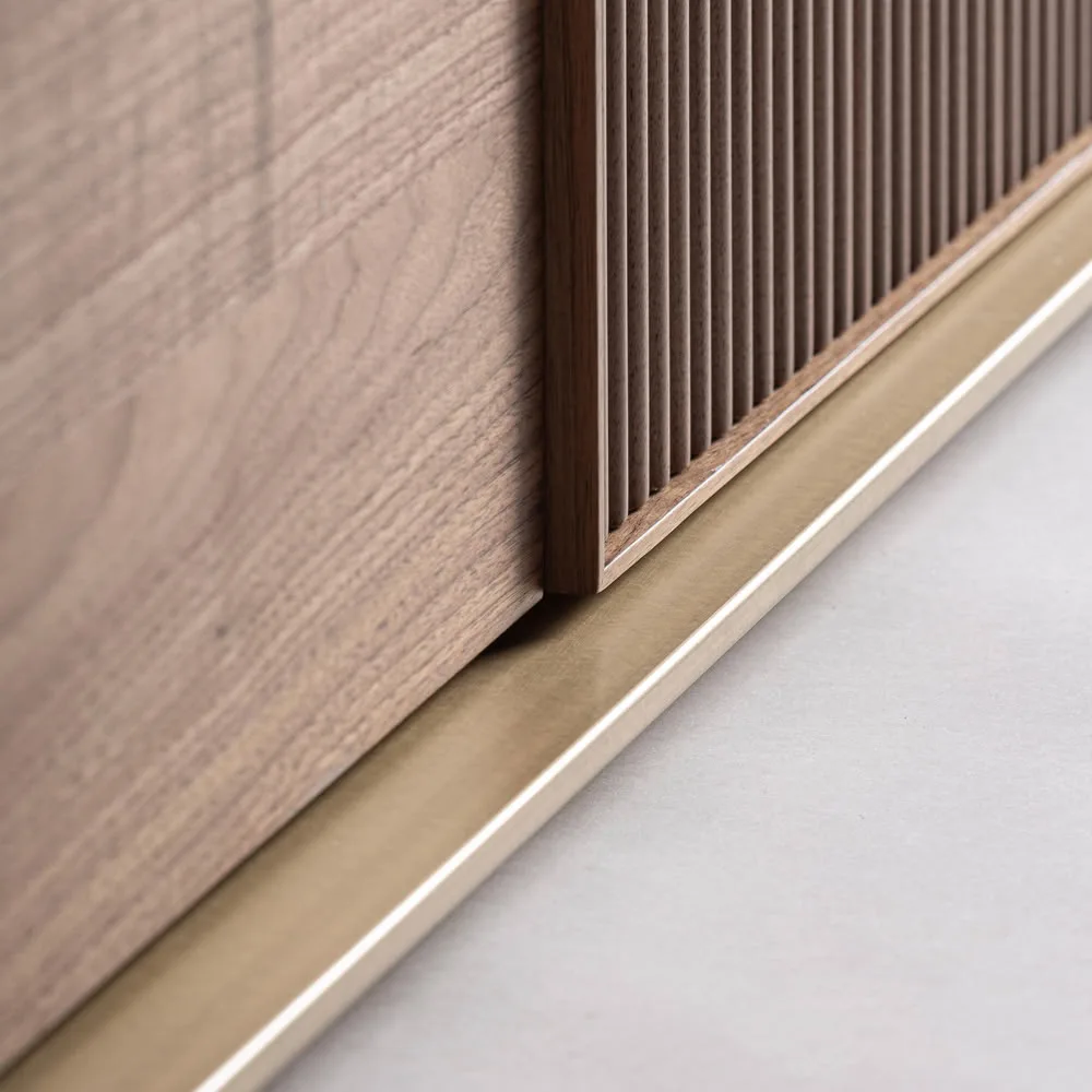 Mueble tv Aisby de estilo contemporáneo fabricado en madera de fresno en color marrón claro combinado con cristal en color marrón con acabado templado y acero inoxidable en color champagne. Producto desmontable.