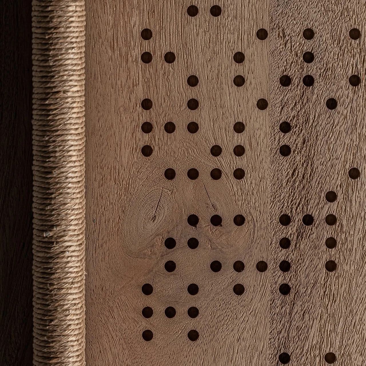 Mueble tv de diseño jacquard de estilo contemporáneo. Fabricado en madera de mango en color marrón claro.
