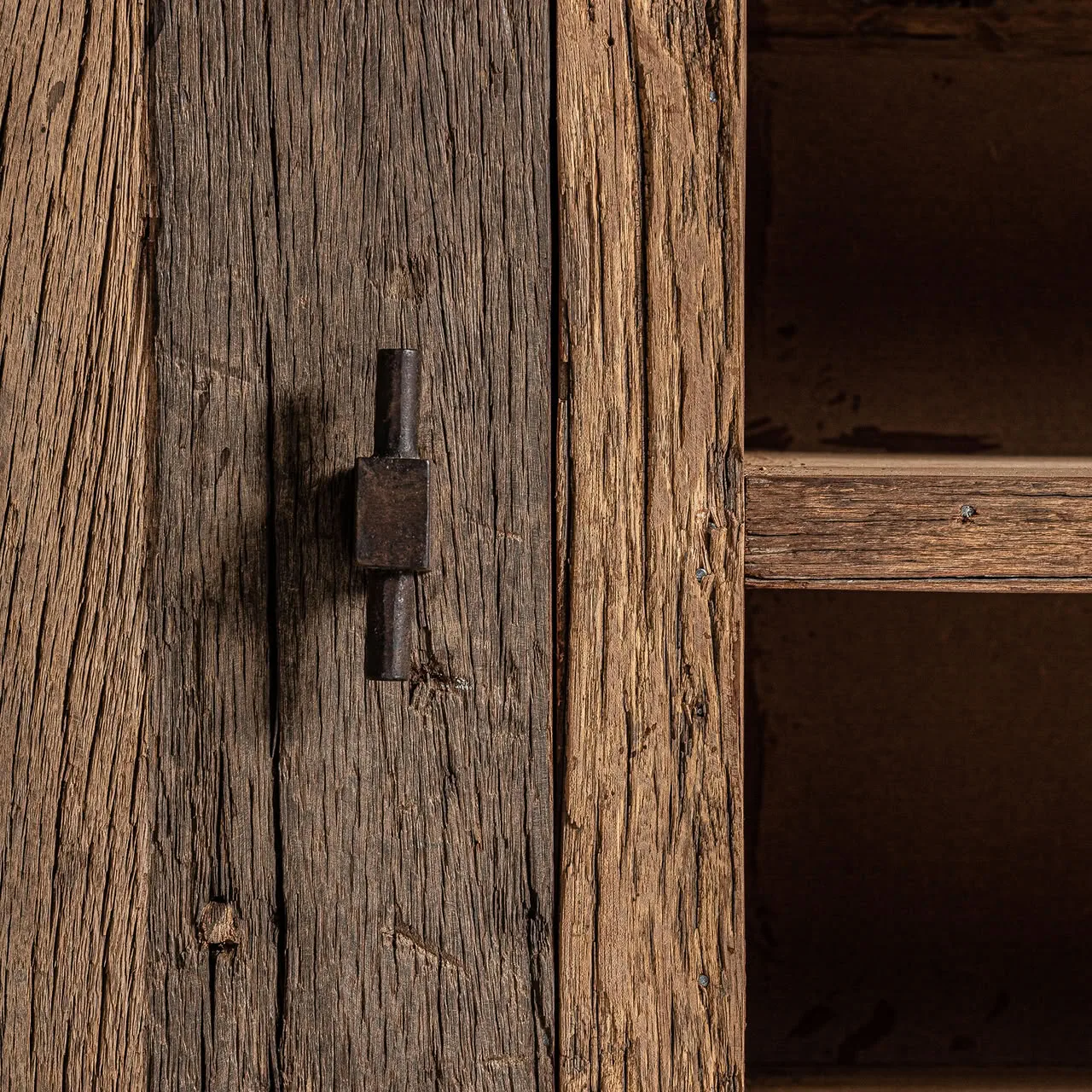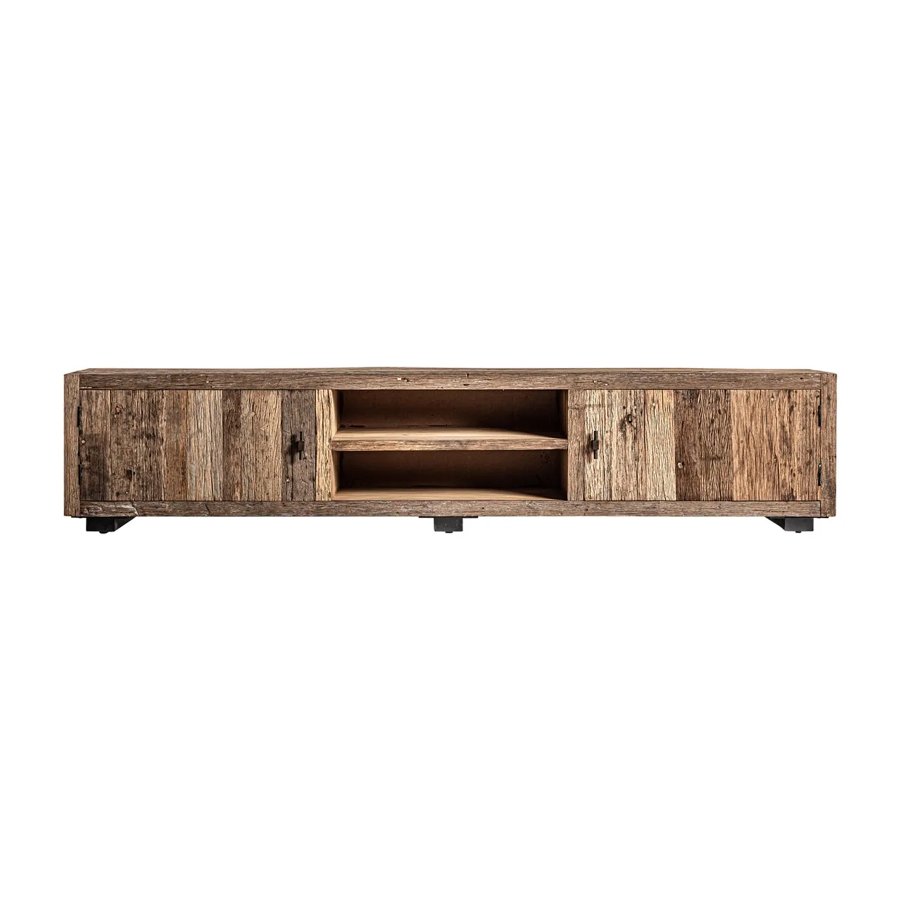 Mueble tv carrik de estilo colonial fabricado en madera recuperada en color marrón combinado con hierro.