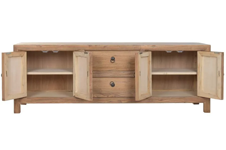 Mueble de televisión de madera reciclada y olmo en tono natural, con 4 puertas y 2 cajones para una organización completa. Su acabado cálido y sostenible de inspiración balinesa lo convierte en una pieza con carácter para cualquier salón. Mide 160 cm de ancho, 40 cm de fondo y 55,5 cm de alto.