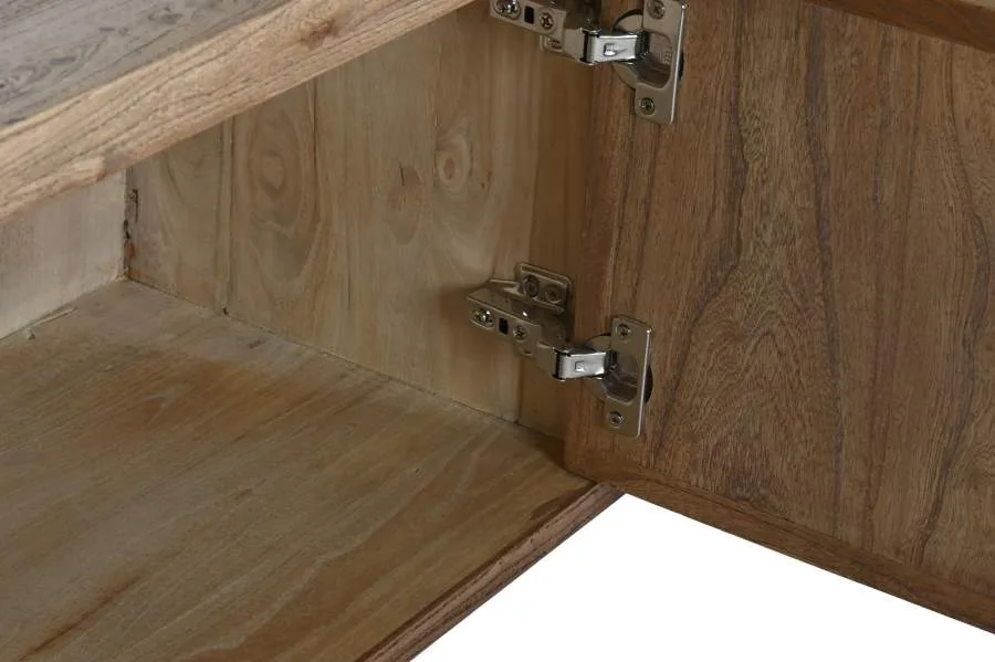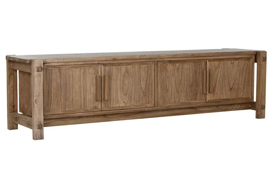 Mueble de televisión de madera reciclada y olmo en color natural con 4 puertas, de inspiración balinesa y oriental. Su perfil bajo y sus materiales con historia lo convierten en una opción original para salones que buscan un mueble TV de madera reciclada con una estética cálida y auténtica alejada de los diseños convencionales. Mide 181 cm de ancho, 45 cm de fondo y 48 cm de alto.