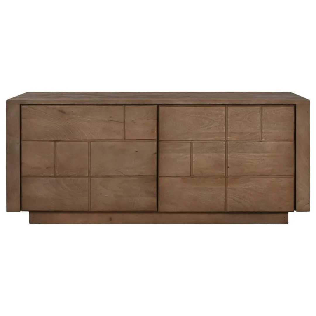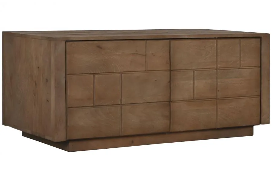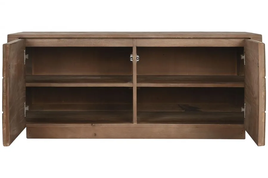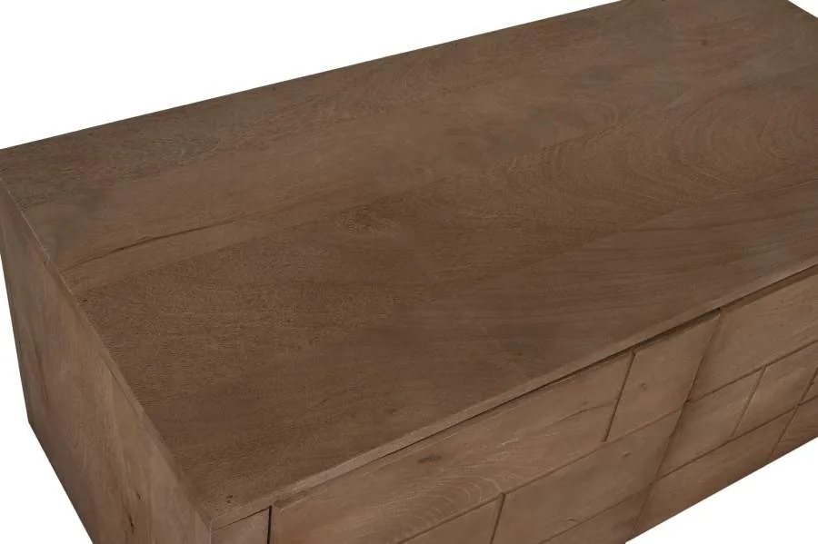 Mueble de televisión compacto de madera de mango en color natural con 2 puertas y estantes interiores, de estética moderna. Su formato reducido lo convierte en la opción ideal para dormitorios, habitaciones juveniles o salones pequeños que buscan un mueble TV de madera maciza natural funcional sin ocupar demasiado espacio. Mide 110 cm de ancho, 50 cm de fondo y 46 cm de alto.