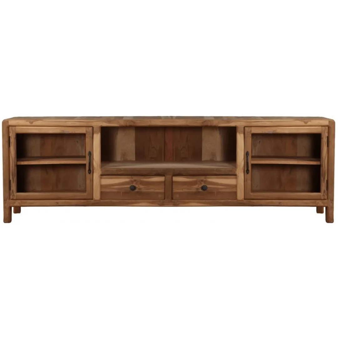 El mueble de TV de teca reciclada y cristal combina la calidez de la madera natural con la ligereza visual del vidrio, creando una pieza funcional y elegante para el salón. Fabricado en madera de teca reciclada, cada unidad presenta vetas y matices únicos que realzan su carácter auténtico. Sus puertas con paneles de cristal permiten organizar dispositivos y objetos decorativos sin perder visibilidad, mientras que su formato amplio de 200 × 35 × 65 cm ofrece una solución práctica y estética para el espacio audiovisual.